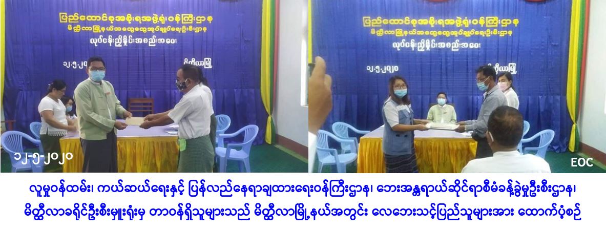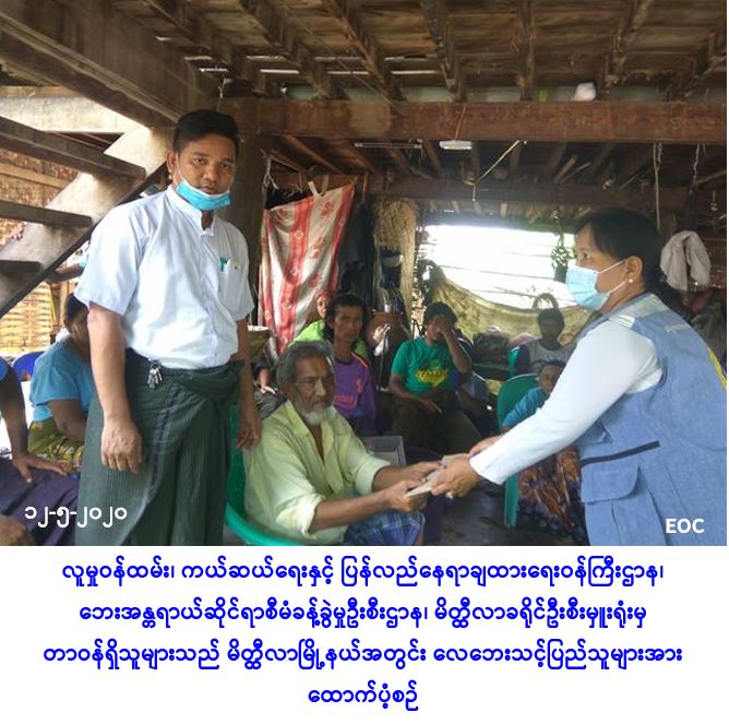 လူမှုဝန်ထမ်း၊ ကယ်ဆယ်ရေးနှင့် ပြန်လည်နေရာချထားရေးဝန်ကြီးဌာန၊ ဘေးအန္တရာယ်ဆိုင်ရာစီမံခန့်ခွဲမှုဦးစီးဌာန၊ မိတ္ထီလာခရိုင်ဦးစီးမှူးရုံးမှ တာဝန်ရှိသူများသည် (၁၂-၅-၂၀၂၀) ရက်နေ့တွင် မိတ္ထီလာမြို့နယ်၊ ရပ်ကွက်/ကျေးရွာအုပ်စုများရှိ လေဘေးသင့်အိမ်ခြေ (၂၆)လုံး၊ ဘာသာရေးကျောင်း(၁) ကျောင်းတို့အတွက် အိမ်ဆောက်ပစ္စည်းဖိုးငွေ (၁၀၂၈၀၀ဝိ/-)၊ လူဦးရေ (၁၂၄) ဦးအတွက် ဆန်ရိက္ခာဖိုးထောက်ပံ့ငွေ (၂၆၀၄၀ဝိ/-)နှင့် မိုးကြိုးစက်ကွင်းမိ၍ သေဆုံးသူ(၁)ဦးအတွက် ထောက်ပံ့ငွေ(၃၀၀၀၀ဝိ/-)၊ စုစုပေါင်းထောက်ပံ့မှု (၁၅၈၈၄၀ဝိ/-) အား မြို့နယ်အုပ်ချုပ်ရေးမှူး၊ တာဝန်ရှိသူများနှင့်အတူ ထောက်ပံ့ပေးအပ်ခဲ့ကြောင်း သတင်းရရှိပါသည်။
