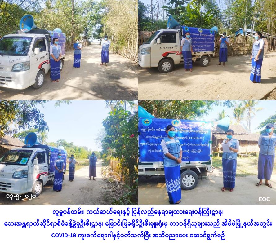 လူမှုဝန်ထမ်း၊ ကယ်ဆယ်ရေးနှင့် ပြန်လည်နေရာချထားရေးဝန်ကြီးဌာန၊ ဘေးအန္တရာယ်ဆိုင်ရာ စီမံခန့်ခွဲမှုဦးစီးဌာန၊ မြောင်းမြခရိုင်ဦးစီးမှူးရုံးမှ တာဝန်ရှိသူများသည် (၁၃-၅-၂၀၂၀) ရက်နေ့၊ နံနက် (၀၇:၃၀) နာရီအချိန်မှစ၍ နေ့လည် (၁၂:၀၀) နာရီအချိန်အထိ မြောင်းမြခရိုင်၊ အိမ်မဲမြို့နယ် အင်းတမိသက္ကယ်ကျေးရွာ၊ ကဇင်းရိုးကျေးရွာ၊ သက္ကယ်ကျေးရွာ၊ သပြုပင်ဆိပ်ကျးရွာ၊ ကြို့ကုန်းကျေးရွာ၊ ရေတွင်းကုန်းကျေးရွာ၊ သင်္ကန်းကုန်းကျေးရွာ၊ ပေပင်စုကျေးရွာ၊ အောက်ပိုင်းကျေးရွာနှင့် ကျွန်းတောစုကျေးရွာတို့တွင် COVID-19 ကူးစက်ရောဂါနှင့်ပတ်သက်ပြီး ဆောင်ရန်/ရှောင်ရန်များကို ကျေးရွာနေပြည်သူလူထုအား အသိပညာပေးခြင်းများ ပြုလုပ်ဆောင်ရွက်ခဲ့ကြောင်း သတင်းရရှိပါသည်။