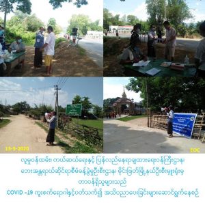 လူမှုဝန်ထမ်း၊ ကယ်ဆယ်ရေးနှင့် ပြန်လည်နေရာချထားရေးဝန်ကြီးဌာန၊ ဘေးအန္တရာယ်ဆိုင်ရာစီမံခန့်ခွဲမှုဉီးစီးဌာန၊ မိုင်းဖြတ်မြို့နယ်ဦးစီးမှူးရုံးမှ တာဝန်ရှိသူများသည် (၁၃-၅-၂၀၂၀) ရက်နေ့တွင် မြို့နယ်ပြည်သူ့ကျန်းမာရေးဦးစီးဌာန၊ မြို့နယ် ကြက်ခြေနီအသင်း၊ မြို့နယ်ရဲတပ်ဖွဲ့၊ မြို့နယ်ထွေွအုပ်ဦးစီးဌာနတို့နှင့်ပူးပေါင်း၍ မြို့အဝင်စုပေါင်းဂိတ်၌ မြို့တွင်းသို့အ၀င် /အထွက် မော်တော်ယာဉ်များတွင် စီးနှင်းလိုက်ပါသော ခရီးသည်များအား ကျန်းမာရေးစစ်ဆေးခြင်း၊ မှတ်တမ်ကောက်ယူခြင်းနှင့် မိုင်းဖြတ်မြို့နယ်၊ ဝမ်နောင်ကျေးရွာတွင် လတ်တစ်လော နိုင်ငံအသီးသီးတွင် ကူးစက်ပြန့်ပွားလျက်ရှိသော COVID – 19 ကူးစက် ရောဂါ ကြိုတင်ကာကွယ်ထိန်းချုပ်နိုင်ရေးအတွက် COVID-19ရောဂါကူးစက်ပြန့်နှံ့မှု မဖြစ်ပွားစေရန် သိရှိလိုက်နာဆောင်ရွက်ရမည့် အချက်များကို အသိပညာပေးနှိုးဆောင်ခဲ့ပါကြောင်း သတင်းရရှိပါသည်။