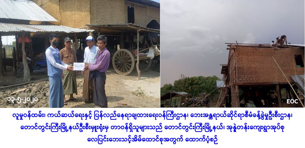 လူမှုဝန်ထမ်း၊ ကယ်ဆယ်ရေးနှင့် ပြန်လည်နေရာချထားရေးဝန်ကြီးဌာန၊ ဘေးအန္တရာယ်ဆိုင်ရာ စီမံခန့်ခွဲမှုဦးစီးဌာန၊ တောင်တွင်းကြီးမြို့နယ်ဦးစီးမှူးရုံးမှ တာဝန်ရှိသူများသည် မကွေးတိုင်းဒေသကြီး၊ တောင်တွင်းကြီးမြို့နယ်၊ အုန္နဲတန်းကျေးရွာအုပ်စု၊ အုန္နဲတန်းကျေးရွာတို့၌ (၁၁-၅-၂၀၂၀) ရက်နေ့တွင် မိုးသက်လေပြင်းတိုက်ခတ်မှုကြောင့် အမိုးလန်ခဲ့သည့်အိမ်ခြေ (၁) လုံး၊ အိမ်ထောင်စု (၁) စု၊ လူဦးရေ (၅) ဦးတို့အတွက် အိမ်ဆောက်ပစ္စည်းဖိုး (၅၀,၀၀၀) ကျပ်၊ ဆန်ရိက္ခာဖိုး(၇)ရက်စာ (၁၀,၅၀ဝ) ကျပ်၊ စုစုပေါင်းထောက်ပံ့ငွေ (၆၀,၅၀ဝ) ကျပ်အား (၁၃-၅-၂၀၂၀) ရက်နေ့၊ (၁၁:၀၀) နာရီအချိန်တွင် ကျေးရွာအုပ်စုအုပ်ချုပ်ရေးမှူးများနှင့်အတူ ဘေးသင့်ပြည်သူများလက်ဝယ်အရောက် သွားရောက်ထောက်ပံ့ပေးအပ်ခဲ့ကြောင်း သတင်းရရှိပါသည်။