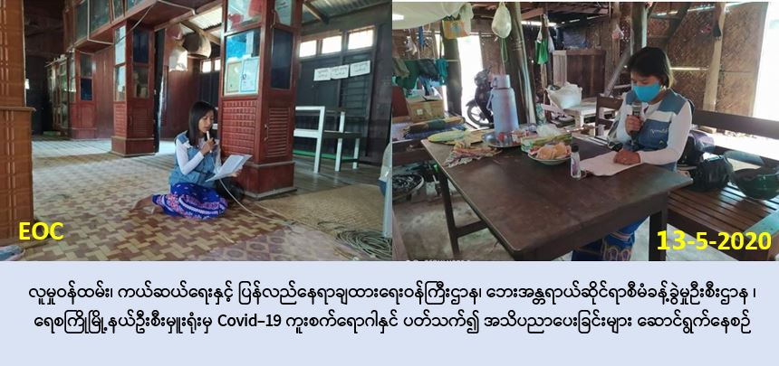 လူမှုဝန်ထမ်း၊ ကယ်ဆယ်ရေးနှင့် ပြန်လည်နေရာချထားရေးဝန်ကြီးဌာန၊ ဘေးအန္တရာယ်ဆိုင်ရာ စီမံခန့်ခွဲမှုဦးစီးဌာန၊ ရေစကြိုမြို့နယ်ဦးစီးမှူးရုံးမှ တာဝန်ရှိသူများသည် (၁၃-၅-၂၀၂၀) ရက်နေ့ တွင် (၀၇:၃၀)နာရီမှစတင်၍(၁၂:၀၀)အချိန်ထိ ရေစကြိုမြို့နယ်၊ ဆင်တဲကျေးရွာအုပ်စု၊ဆင်တဲ ကျေးရွာ၊ ခြံယာကျေးရွာ၊ နတ်ပေးကျေးရွာ၊ မြောက်ရွာကျေးရွာ၊ ကျွန်းညိုကျေးရွာနှင့် လှေခုတ် ကျေးရွာတို့တွင် COVID-19 ရောဂါ ကူးစက်ပျံ့နှံ့မှုများ မဖြစ်ပွားစေရန်အတွက် သိရှိလိုက်နာ ဆောင်ရွက်ရန်များကို လော်စပီကာဖြင့် အသိပညာပေး ဆောင်ရွက်ခဲ့ပါကြောင်း သတင်း ရရှိပါသည်။