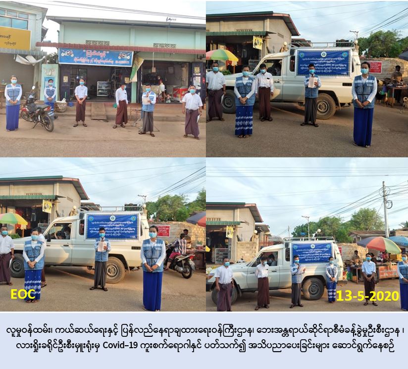 လူမှုဝန်ထမ်း၊ ကယ်ဆယ်ရေးနှင့် ပြန်လည်နေရာချထားရေးဝန်ကြီးဌာန၊ ဘေးအန္တရာယ်ဆိုင်ရာ စီမံခန့်ခွဲမှုဦးစီးဌာန၊ လားရှိုးခရိုင်ဦးစီးမှူးရုံးမှ တာဝန်ရှိသူများသည် ပြန်လည်ထူ ထောင်ရေး ဦးစီးဌာန၊ မူးယစ်ဆေးဖြတ်ပြီးသူများ ပြန်လည်ထူထောင်ရေးစခန်း၊ လူမှုဝန်ထမ်းဦးစီးဌာန၊ မြို့နယ်အထွေထွေအုပ်ချုပ်ရေးဦးစီးဌာနတို့ ပူးပေါင်း၍ (၁၃-၅-၂၀၂၀) ရက်နေ့တွင် လားရှိုးမြို့ နယ်၊ သီရိမဟာရပ်ကွက်၊ အောင်မင်္ဂလာရပ်ကွက်နှင့် လားရှိုးပညာရေးကောလိပ်၌ တစ်ညအိပ် တည်းခိုနေထိုင်ရသော နေရပ်ပြန်ပြည်သူများအား COVID-19 ရောဂါကူးစက်ပျံ့နှံ့မှု မဖြစ်ပွား စေရန် သိရှိလိုက်နာ ဆောင်ရွက်ရမည့်အချက်များကို အသိပေးပန်ကြားခြင်းများကို ဆောင်ရွက် ခဲ့ကြောင်း သတင်းရရှိပါသည်။