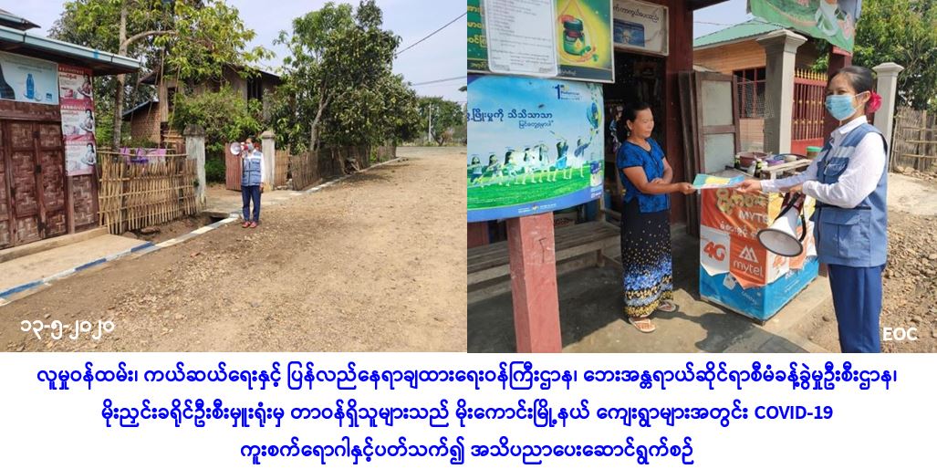 လူမှုဝန်ထမ်း၊ ကယ်ဆယ်ရေးနှင့် ပြန်လည်နေရာချထားရေးဝန်ကြီးဌာန၊ ဘေးအန္တရာယ်ဆိုင်ရာ စီမံခန့်ခွဲမှုဦးစီးဌာန၊ မိုးညှင်းခရိုင်ဦးစီးမှူးရုံးမှ တာဝန်ရှိသူများသည် (၁၃-၅-၂၀၂၀) ရက်နေ့၊ (၀၉:၃၀) နာရီအချိန်တွင် မိုးကောင်းမြို့နယ်၊ ပင်လုံကျေးရွာ၊ အင်ကြင်းကုန်းကျေးရွာ၊ သိုက်ဝါးကုန်းကျေးရွာနှင့် အုန်းဘောင်ကျေးရွာများအတွင်း COVID-19 ကူးစက်ရောဂါနှင့်ပတ်သက်၍ ဆောင်ရန်/ရှောင်ရန်အချက်များ၊ လိုက်နာရမည့်အချက်များအား အသိပညာပေးနှိုးဆော်ခြင်းများ ဆောင်ရွက်ခဲ့ကြောင်း သတင်းရရှိပါသည်။