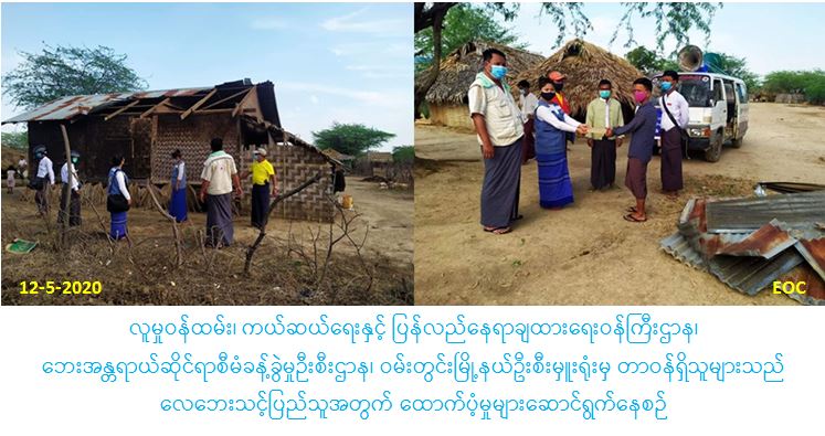 လူမှုဝန်ထမ်း၊ ကယ်ဆယ်ရေးနှင့် ပြန်လည်နေရာချထားရေးဝန်ကြီးဌာန၊ ဘေးအန္တရာယ်ဆိုင်ရာစီမံခန့်ခွဲမှုဉီးစီးဌာန၊ ဝမ်းတွင်းမြို့နယ်ဦးစီးမှူးရုံးမှ တာဝန်ရှိသူများသည် (၁၁-၅-၂၀၂၀) ရက်နေ့၌ လူးခင်းအုပ်စု၊ ငရံ့ကြီးကုန်းကျေးရွာတွင် လေပြင်းတိုက်ခတ်မှုကြောင့် အမိုးလန်ပျက်စီးခဲ့သည့် နေအိမ်(၁)လုံးအတွက် အိမ်ဆောက်ပစ္စည်းဖိုးထောက်ပံ့ငွေ (၆၁၀၀ဝ/-)ကျပ် နှင့် ဘေးသင့်လူဦးရေ(၃)ဦးအတွက် ဆန်ရိက္ခာ(၇)စားဖိုးထောက်ပံ့ငွေ (၆၃၀ဝ/-)ကျပ်၊ စုစုပေါင်းထောက်ပံ့ငွေ(၆၇၃၀ဝ/-)ကျပ် အား (၁၂-၅-၂၀၂၀)ရက်နေ့ (၁၃:၀၀)နာရီအချိန်တွင် ကျေးရွာအုပ်ချုပ်ရေးမှူးနှင့်အတူ ဘေးသင့်နေအိမ်သို့ ကွင်းဆင်း ထောက်ပံ့ပေးအပ် ခဲ့ပါကြောင့် သတင်းရရှိပါသည်။
