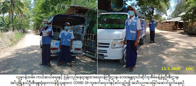 လူမှုဝန်ထမ်း၊ ကယ်ဆယ်ရေးနှင့် ပြန်လည်နေရာချထားရေးဝန်ကြီးဌာန၊ ဘေးအန္တရာယ်ဆိုင်ရာစီမံခန့်ခွဲမှုဦးစီး ဌာန၊ အင်္ဂပူမြို့နယ်ဦးစီးမှူးရုံးမှတာဝန်ရှိသူများသည် (၁၃-၅-၂၀၂၀) ရက်နေ့တွင် ကညွတ်ကွင်းကျေးရွာအုပ်စုရှိ ရှားတောကျေးရွာ၊ ကညွတ်ကွင်းကျေးရွာ၊ ဝါဘိုကျေးရွာ၊ သရက်အုပ်ကျေးရွာ၊ လှံထိုးကုန်းကျေးရွာ၊ ဘဲပြာကျေးရွာ၊ဇီးဖြူကုန်းကျေးရွာများနှင့် ဘွက်အုပ်စုရှိ ဘွက်အနောက်ကျေးရွာ၊ နင်းကြမ်းကုန်းကျေးရွာ၊ စိန်ကျောင်းကုန်းကျေးရွာ၊ ဘွက်အလယ်ကျေးရွာ၊ ရွှေလောင်းကန်ကကျေးရွာများအတွင်း၌ COVID-19 ကူးစက်ရောဂါနှင့်စပ်လျဉ်း၍ ကာကွယ်၊ တားဆီး၊ ထိန်းချုပ်၊ ကုသရေးဆိုင်ရာ ဆောင်ရန်/ရှောင်ရန်အချက်များကို အသံချဲ့စက်ဖြင့် အသိပညာပေးနှိုးဆော်ခဲ့ပါကြောင်း သတင်းရရှိပါသည။