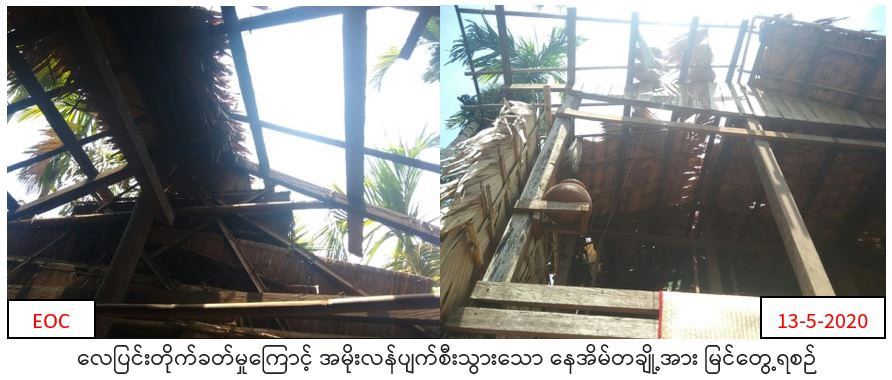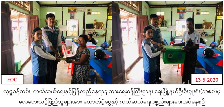 လူမှုဝန်ထမ်း၊ ကယ်ဆယ်ရေးနှင့်ပြန်လည်နေရာချထားရေးဝန်ကြီးဌာန၊ ဘေးအန္တရာယ်ဆိုင်ရာစီမံခန့်ခွဲမှုဦးစီးဌာန၊ မော်လမြိုင်ခရိုင်၊ ရေးမြို့နယ်ဦးစီးမှူးရုံးမှ တာဝန်ရှိသူများသည် (၁၁-၅-၂၀၂၀) ရက်နေ့ (၁၄:၃၀)အချိန်၌ ဖြစ်ပွားခဲ့သော လေပြင်းတိုက်ခတ်မှုကြောင့် ရေးမြို့နယ်၊ ကျောင်းရွာကျေးရွာအုပ်စု၊ အိုင်ရှည်ကျေးရွာနှင့် ကိုင်းတောကျေးရွာများရှိ ပြိုကျ/ပျက်စီးဆုံးရှုံးခဲ့သည့် အိမ်ထောင်စု(၁)စု ၊ တစ်စိတ်တစ်ပိုင်းပျက်စီး ဆုံးရှုံးခဲ့သည့်အိမ်ထောင်စု (၇)စု၊ စုစုပါင်း အိမ်ခြ(၈)စု၊ အိမ်ထောင်စု(၈)စုတို့မှ လူဦးရေ(၂၈) ဦးတို့ လေဘေးသင့်ခဲ့ပါသဖြင့် ပျက်စီးအိမ်ခြေ(၈)လုံးအတွက် အိမ်ဆောက်ပစ္စည်းဖိုးထောက်ပံ့ငွေ (၇၃၀၀၀၀ိ/-)၊ လူဦးရေ(၂၈)ဦး အတွက် (၇) ရက်စာ ဆန်ရိက္ခာဖိုး ထောက်ပံ့ငွေ (၅၈၈၀၀ိ/-)၊ စုစုပေါင်း ထောက်ပံ့ဖိုးငွေ(၇၈၈၈၀၀ိ/-)ကျပ်နှင့် ပြိုကျပျက်စီးအိမ်ထောင်စုအတွက် ကယ်ဆယ်ရေး ပစ္စည်း(၁၆)မျိုး၊ (၁)စုံအား မြို့နယ်အထွေထွေအုပ်ချုပ်ရေးမှူးတို့နှင့်အတူ (၁၃-၅-၂၀၂၀) ရက်နေ့၊ (၁၆:၀၀) နာရီချိန်တွင် ဘေးသင့် ပြည်သူများထံသို့ ထောက်ပံ့ပေးအပ်ခဲ့ပါကြောင်း သတင်းရရှိပါသည်။