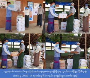 လူမှုဝန်ထမ်း၊ ကယ်ဆယ်ရေးနှင့် ပြန်လည်နေရာချထားရေးဝန်ကြီးဌာန၊ ဘေးအန္တရာယ်ဆိုင်ရာ စီမံခန့်မှုဦးစီးဌာန၊ ဘူးသီးတောင်မြို့နယ်ဦးစီးမှူးရုံးမှ တာဝန်ရှိသူများသည် (၁၃-၅-၂၀၂၀) ရက် နေ့တွင် ဘူးသီးတောင်မြို့နယ် အတွင်းရှိတိုက်ပွဲရှောင်စုရပ်စခန်းများသို့ မြောင်းနားတိုက်ပွဲရှောင် စုရပ်ရှိ (အထစ) (၈၂) စု၊ လူဦးရေ (၄၂၄) ဦးအား လက်သန့်ဆေးရည် (၈၂) ဘူး၊ အပူချိန်တိုင်း ကရိယာ (၁) ခုအားလည်းကောင်း ဝရကျွန်းကျေးရွာ ဘင်္ဂါလီတိုက်ပွဲရှောင်စုရပ်ရှိ (အထစ) (၁၀၅) စု၊ လူဦးရေ (၇၁၂) ဦးအားထုံး (၅) အိတ်၊ ဗွီနိုင်း (၁)ချပ်၊ လက်သန့်ဆေးရည် (၁၀၅) ဘူး၊ အပူချိန်တိုင်းကရိယာ (၁) ခု၊ Mask (၂၁၀)ခု၊ ဆပ်ပြာ (၇၁၂) ခဲအားလည်းကောင်း စုရပ်စခန်း တာဝန်ရှိသူများထံ သွားရောက်လွှဲပြောင်းထောက်ပံ့ပေးခဲ့ပါကြောင်း သတင်းရရှိပါသည်။