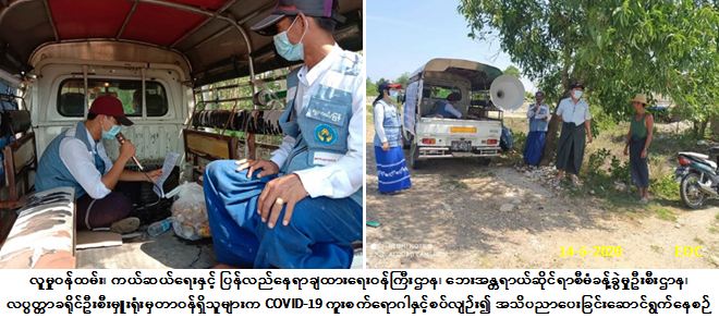 လူမှုဝန်ထမ်း၊ ကယ်ဆယ်ရေးနှင့် ပြန်လည်နေရာချထားရေးဝန်ကြီးဌာန၊ ဘေးအန္တရာယ်ဆိုင်ရာစီမံခန့်ခွဲမှုဦးစီးဌာန၊ လပွတ္တာခရိုင်ဦးစီးမှူးရုံးမှ တာဝန်ရှိသူများသည် (၁၄-၅-၂၀၂၀) ရက်နေ့၊ (၀၈:၃၀)နာရီအချိန်မှ (၁၂:၀၀)နာရီအချိန်အထိ လပွတ္တာမြို့နယ်၊ ကသဘောင်းကျေးရွာအုပ်စု၊ တောင်တန်းကြီးကျေးရွာ၊ ချောင်းဝကျေးရွာ၊ ကန်ချောင်းကျေးရွာနှင့် အောက်ကုန်းကျေးရွာများ၌ COVID-19 ကူးစက်ရောဂါနှင့်စပ်လျဉ်း၍ ဆောင်ရန်/ရှောင်ရန်အချက်များကို လှည့်လည်အသိပညာပေးနှိုးဆော်ခဲ့ပါကြောင်း သတင်းရရှိပါသည်။