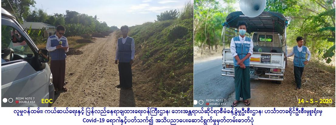 လူမှုဝန်ထမ်း၊ ကယ်ဆယ်ရေးနှင့် ပြန်လည်နေရာချထားရေး ဝန်ကြီးဌာန၊ ဘေးအန္တရာယ်ဆိုင်ရာစီမံခန့်ခွဲမှုဦးစီးဌာန၊ ဟင်္သာတ ခရိုင်ဦးစီးမှူးရုံးမှ တာဝန်ရှိသူများသည် (၁၄-၅-၂၀၂၀) ရက်နေ့ (၀၈:၃၀)နာရီချိန်မှ (၁၂:၀၀) နာရီအထိ လေးမျက်နှာမြို့နယ် အတွင်းရှိ ကညင်သောင်အုပ်စု၊ ကုန်းကြီးကျေးရွာ၊ ညောင်ပင်ကွင်းကျေးရွာ၊ ဘုတ်ချောင်းအုပ်စု၊ ဘုတ်ချောင်းကျေးရွာ၊ ထိန်ကျော်ကျေးရွာ၊ ဇီးချောင်းကျေးရွာတို့တွင် လှည့်လည်ပြီး လတ်တလောဖြစ်ပွားလျက်ရှိသော COVID-19 ကူးစက်ရောဂါနှင့်ပတ်သက်ပြီး ဆောင်ရန်/ရှောင်ရန် များအား ကျေးရွာနေပြည်သူများအား အသိပညာပေးနှိုးဆော်ခြင်းများကို ဆောင်ရွက်ခဲ့ပါကြောင်း သတင်းရရှိပါသည်။