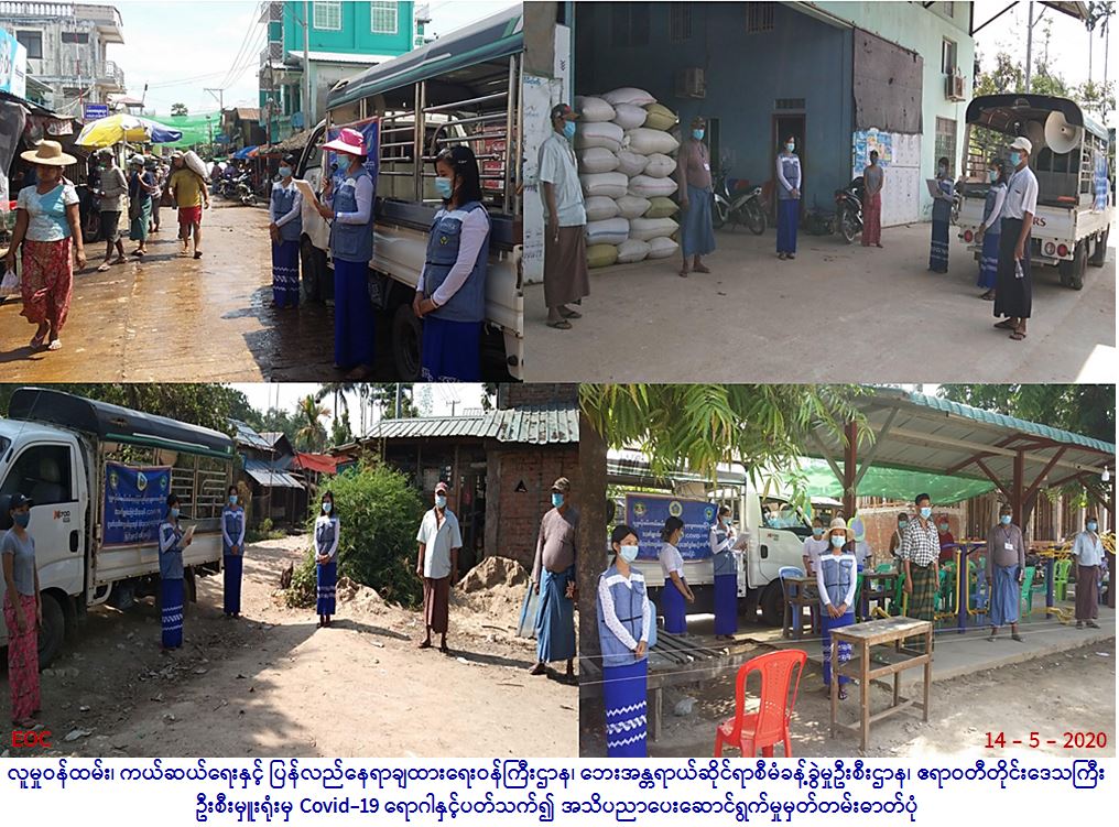 လူမှုဝန်ထမ်း၊ ကယ်ဆယ်ရေးနှင့် ပြန်လည်နေရာချထားရေးဝန်ကြီးဌာန၊ ဘေးအန္တရာယ်ဆိုင်ရာစီမံခန့်ခွဲမှုဦးစီးဌာန၊ ဧရာဝတီ တိုင်းဒေသကြီးဦးစီးမှူးရုံးမှ တာဝန်ရှိသူများသည် (၁၄-၅-၂၀၂၀) ရက်နေ့ (၀၈:၀၀)နာရီအချိန်မှစ၍ ပုသိမ်ခရိုင်၊ ကန်ကြီးထောင့် မြို့နယ်၊ မြင်းကဆိပ်ကျေးရွာအုပ်စု၊ မြင်းကဆိပ်ကျေးရွာ၊ ထီးတော်မိုးကျေးရွာ၊ တလိုင်းစုကျေးရွာ၊ တံတားကြီးကျေးရွာ၊ ရေတွင်းချောင် ကျေးရွာ၊ စာဖြူစုကျေးရွာ၊ ကွင်းစုကျေးရွာ၊ ကြက်ကုန်းကျေးရွာနှင့် ထန်းပင်ချောင်ကျေးရွာတို့၌ လတ်တလော နိုင်ငံအသီးသီးတွင် ကူးစက်ပြန့်ပွားလျက်ရှိသော COVID-19 ကူးစက်ရောဂါနှင့်ပတ်သက်၍ သက်ဆိုင်ရာတာဝန်ရှိသူများနှင့် အတူ ကျေးရွာနေပြည်သူများအား အသိပညာပေးဟောပြောခြင်းများဆောင်ရွက်ခဲ့ပါကြောင်း သတင်းရရှိပါသည်။