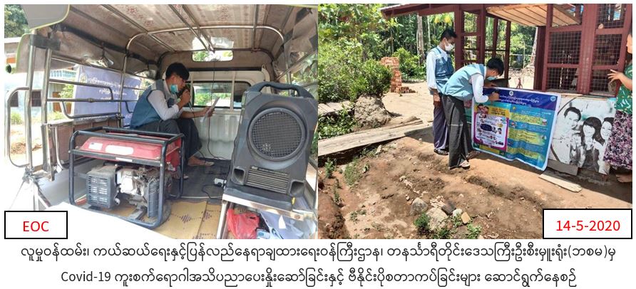 လူမှုဝန်ထမ်း၊ ကယ်ဆယ်ရေးနှင့်ပြန်လည်နေရာချထားရေးဝန်ကြီးဌာန၊ ဘေးအန္တရာယ်ဆိုင်ရာစီမံခန့်ခွဲမှုဦးစီးဌာန၊ တနင်္သာရီတိုင်းဒေသကြီးဦးစီးမှူးရုံး မှ တာ၀န်ရှိသူများသည် (၁၄.၅.၂၀၂၀)ရက်နေ့တွင် တနင်္သာရီတိုင်းဒေသကြီး၊ ထား၀ယ်ခရိုင် ၊ ရေဖြူမြို့နယ်၊ ကံပေါက်ကျေးရွာအုပ်စု၊ မြသီတာရပ်ကွက်၊ ခိုင်သဇင်ရပ်ကွက်၊ သီရိမင်္ဂလာရပ်ကွက်တို့တွင် (Covid-19) အသက်ရှူလမ်းကြောင်းဆိုင်ရာရောဂါ ကြိုတင်ကာကွယ် ထိန်းချုပ်နိုင်ရန် အများပြည်သူသို့ အသိပညာပေးပန်ကြားချက်များအား လော်စပီကာဖြင့် လှည့်လည်ကြေညာခြင်းနှင့် ဗီနိုင်းပိုစတာများ ကပ်ခြင်းတို့ကို ဆောင်ရွက်ခဲ့ကြောင်း သတင်းရရှိပါသည်။