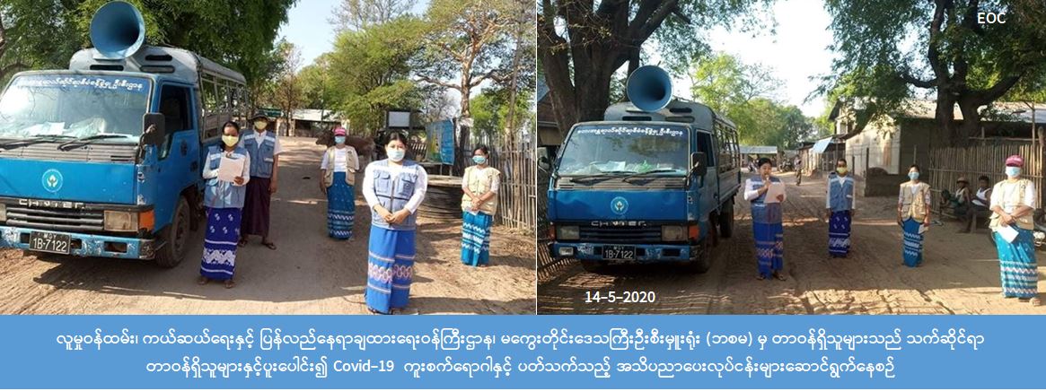 လူမှုဝန်ထမ်း၊ ကယ်ဆယ်ရေးနှင့် ပြန်လည်နေရာချထားရေးဝန်ကြီးဌာန၊ ဘေးအန္တရာယ်ဆိုင်ရာစီမံခန့်ခွဲမှုဉီးစီး ဌာန၊ မကွေးတိုင်းဒေသကြီးဦးစီးမှူးရုံးမှ တာဝန်ရှိသူများသည် (၁၄-၅-၂၀၂၀) ရက်နေ့ နံနက်(၀၇:၀၀)အချိန်မှ စတင်ပြီး မကွေးမြို့နယ်၊ အင်းကုန်းကျေးရွာ၊ ပိတောက်ငုတ်ကျေးရွာနှင့် တံခွန်တိုင်ကျေးရွာများသို့ လှည့်လည်ပြီး COVID -19 ကူးစက်ရောဂါနှင့်ပတ်သက်ပြီး ဆောင်ရန်၊ ရှောင်ရန် တို့ကို ရပ်ကွက်အုပ်ချုပ်ရေးမှူး၊ လူမှုဝန်ထမ်း ဦးစီးဌာနတို့နှင့်အတူပူးပေါင်း၍ ရပ်ကွက်၊ကျေးရွာနေပြည်သူတို့အား အသိပညာပေးဟောပြောဆောင်ရွက်ခဲ့ ကြောင်း သိရှိရပါသည်။