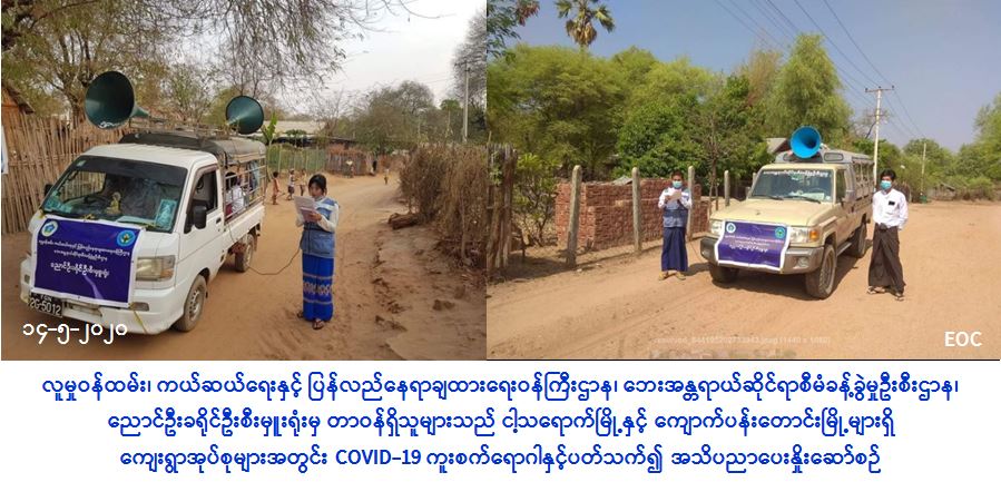 လူမှုဝန်ထမ်း၊ ကယ်ဆယ်ရေးနှင့် ပြန်လည်နေရာချထားရေးဝန်ကြီးဌာန၊ ဘေးအန္တရာယ်ဆိုင်ရာစီမံခန့်ခွဲမှုဦးစီးဌာန၊ ညောင်ဦးခရိုင်ဦးစီးမှူးရုံးမှ တာဝန်ရှိသူများသည် (၁၄-၅-၂၀၂၀) ရက်နေ့တွင် ငါ့သရောက်မြို့အတွင်းရှိ ကျေးရွာအုပ်စု (၇) စုမှ ရွာပေါင်း (၁၁) ရွာနှင့် ကျောက်ပန်းတောင်းမြို့အတွင်းရှိ ကျေးရွာအုပ်စု (၆) စုမှ ရွာပေါင်း (၁၁) ရွာတို့သို့ သွားရောက်၍ Covid-19 ကူးစက်ရောဂါနှင့်ပတ်သက်၍ ကျန်းမာရေးနှင့် အားကစားဝန်ကြီးဌာနမှ ထုတ်ပြန်ထားသော အသိပေးကြေငြာချက်များကို ကျေးလက်နေပြည်သူများ ပိုမိုသတိပြုသိရှိနိုင်ရေး အသိပညာပေးနှိုးဆော်ခြင်းများ ဆောင်ရွက်ခဲ့ကြောင်း သတင်းရရှိပါသည်။