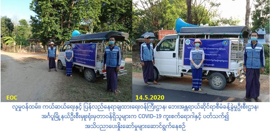 လူမှုဝန်ထမ်း၊ ကယ်ဆယ်ရေးနှင့် ပြန်လည်နေရာချထားရေးဝန်ကြီးဌာန၊ ဘေးအန္တရာယ်ဆိုင်ရာစီမံခန့်ခွဲမှုဦးစီးဌာန၊ အင်္ဂပူမြို့နယ်ဦးစီးမှူးရုံးမှတာဝန်ရှိသူများသည် အထွေထွေအုပ်ချုပ်ရေး ဦးစီးဌာနနှင့် ပူးပေါင်း၍ (၁၄-၅-၂၀၂၀) ရက်နေ့တွင် ကံဦးကျေးရွာအုပ်စုရှိ မြန်အောင်စုကျေးရွာ၊ သုံးဆက်ကျေးရွာ၊ ကံဦးကျေးရွာ၊ ဇေယျကျေးရွာနှင့် ရှမ်းခေါင်းဗြဲအုပ်စုရှိ ရွှေညောင်ပင် အနောက်ကျေးရွာ၊ ရွှေညောင်ပင်အရှေ့ကျေးရွာများအတွင်းရှိ ပြည်သူများအား Covid-19 ကာကွယ်၊ တားဆီး၊ ထိန်းချုပ်၊ ကုသရေးဆိုင်ရာ အသိပညာပေးဆောင်ရန်ရှောင်ရန်အချက်များကို အလွယ်တကူသိရှိလိုက်နာနိုင်ရေး အသံချဲ့စက်ဖြင့် လှည့်လည်၍ အသိပေးနှိုးဆော်ခြင်းလုပ်ငန်းများကို ဆောင်ရွက်ခဲ့ပါကြောင်း သတင်းရရှိပါသည်။