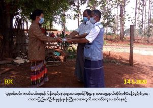 လူမှုဝန်ထမ်း၊ ကယ်ဆယ်ရေးနှင့် ပြန်လည်နေရာချထားရေးဝန်ကြီးဌာန၊ ဘေးအန္တရာယ်ဆိုင်ရာ စီမံခန့်ခွဲမှုဦးစီးဌာန၊ ကယားပြည်နယ်ဦးစီးမှူးရုံးမှ တာဝန်ရှိသူများသည်(၁၄-၅-၂၀၂၀) ရက်နေ့၊ (၁၀:၃၀)နာရီအချိန်တွင် ကယားပြည်နယ်၊ လွိုင်ကော်ခရိုင်၊ လွိုင်ကော်မြို့နယ်၊ လောပိတကျေး ရွာအုပ်စု၊ လောကထုကျေးရွာတွင် (၁၃-၅-၂၀၂၀) ရက်နေ့၌ မိုးသည်းထန်စွာရွာသွန်းပြီး မိုးကြိုး ပစ်ခတ်မှုကြောင့် သေဆုံးသူ (၁) ဉီး အတွက် ထောက်ပံ့ငွေ (၃၀၀၀၀၀/-) ကျပ်အား သွားရောက် ထောက်ပံ့ခဲ့ကြောင်း သတင်းရရှိပါသည်။