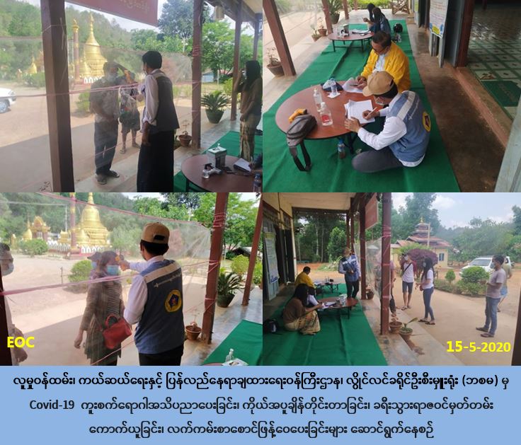 လူမှုဝန်ထမ်း၊ ကယ်ဆယ်ရေးနှင့် ပြန်လည်နေရာချထားရေးဝန်ကြီးဌာန၊ ဘေးအန္တရာယ်ဆိုင်ရာစီမံခန့်ခွဲမှုဦးစီးဌာန၊ လွိုင်လင်ခရိုင်ဦးစီးမှူးရုံးမှတာဝန်ရှိသူများသည် (၁၅-၅-၂၀၂၀) ရက်နေ့တွင် အခြားဌာနဆိုင်ရာများနှင့် ပူးပေါင်း၍ (၈:၀၀) နာရီအချိန်မှ (၁၆:၀၀) နာရီအချိန်ထိ လွိုင်လင်မြို့l ပန်ခေါက်ဝိုးကျေးရွာ Covid-19 စစ်ဆေးရေးဂိတ်၌ ကျိုင်းတုံ – တောင်ကြီး ပြည်ထောင်စုကားလမ်းမပေါ်ရှိ ခရီးသွားပြည်သူများအား အသက်ရှူလမ်းကြောင်းဆိုင်ရာရောဂါ (COVID-19) အသိပညာပေးခြင်း၊ ကိုယ်အပူချိန်တိုင်းတာခြင်း၊ ခရီးသွားရာဇဝင်မှတ်တမ်းယူခြင်း၊ လက်ကမ်းစာစောင်များ ပေးဝေခြင်းများကို ဆောင်ရွက်ခဲ့ပါကြောင်း သိရှိရပါသည်။