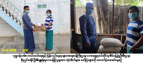 လူမှုဝန်ထမ်း၊ ကယ်ဆယ်ရေးနှင့် ပြန်လည်နေရာချထားရေးဝန်ကြီးဌာန၊ ဘေးအန္တရာယ်ဆိုင်ရာစီမံခန့်ခွဲမှုဉီးစီးဌာန၊ မိုးညှင်းခရိုင်ဦးစီးမှူးရုံးမှတာဝန်ရှိသူများသည် (၁၅-၅-၂၀၂၀) ရက်နေ့၊ (၁၅:၃၀)နာရီအချိန်တွင် မိုးညှင်းမြို့နယ်၊ စိန်ပတ်ထရစ်ဘုရားကျောင်း IDPစခန်းအတွင်းရှိ အိမ်ထောင်စု(၁၂)စုမှ လူဦးရေ(၆၇)ဦးတို့အတွက် ထုံးအိတ်(၁၀)အိတ်၊ ဆပ်ပြာ(၆၇)ခဲနှင့် အပူချိန်တိုင်းကိရိယာ(၁)ခုတို့ကို သွားရောက်ထောက်ပံ့ပေးအပ်ခဲ့ပါကြောင်း သတင်းရရှိပါသည်။
