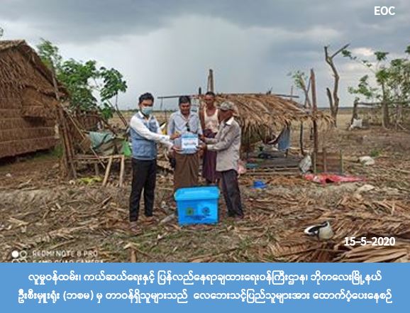 လူမှုဝန်ထမ်း၊ ကယ်ဆယ်ရေးနှင့်ပြန်လည်နေရာချထားရေးဝန်ကြီးဌာန၊ ဘေးအန္တရာယ်ဆိုင်ရာစီမံခန့်ခွဲမှု ဦးစီးဌာန၊ ဘိုကလေးမြို့နယ်ဦးစီးမှူးရုံးမှတာဝန်ရှိသူများသည် (၁၂-၅-၂၀၂၀)ရက်နေ့တွင် ဘိုကလေးမြို့ နယ်၊ သဇင်ကုန်းကျေးရွာအုပ်စု၊ မယ်တော်စု နှာခေါင်းခကျေးရွာတွင်ဖြစ်ပွားခဲ့သော လေဘေးကြောင့် ဘေးသင့်အိမ်ထောင်စု(၁)စုအတွက် ကယ်ဆယ်ရေးပစ္စည်း (၁၇)မျိုး စက္ကူပုံးပါ (၁)အိမ်ထောင်စာ တန်ဖိုး (၃၇,၇၅၃)ကျပ်၊ အိမ်ခြေ(၁)လုံးအတွက် အိမ်ဆောက်ပစ္စည်းဖိုး ထောက်ပံ့ငွေ(၁၀၀,၀၀၀)ကျပ်၊ ဘေးသင့် လူဦးရေ(၅)ဦးအတွက် (၇)ရက်စာဆန်ရိက္ခာဖိုးထောက်ပံ့ငွေ(၁၀,၅၀၀)ကျပ်၊ စုစုပေါင်းထောက်ပံ့ငွေ (၁၁၀,၅၀၀)ကျပ်တို့ကို (၁၅-၅-၂၀၂၀)ရက်နေ့ (၁၄:၀၀)နာရီအချိန်တွင် ဘေးသင့်ပြည်သူများလက်ဝယ်သို့ သက်ဆိုင်ရာတာဝန်ရှိသူများရှေ့မှောက်တွင် ထောက်ပံ့ပေးခဲ့ကြောင်း သိရှိရပါသည်။