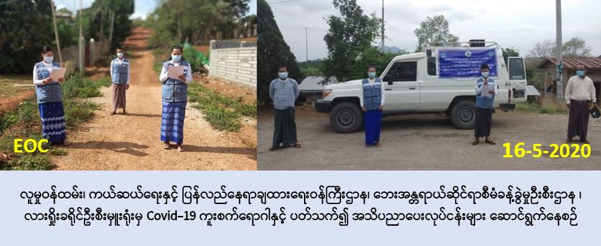 လူမှုဝန်ထမ်း၊ ကယ်ဆယ်ရေးနှင့် ပြန်လည်နေရာချထားရေးဝန်ကြီးဌာန၊ ဘေးအန္တရာယ်ဆိုင်ရာ စီမံခန့်ခွဲမှုဦးစီးဌာန၊ လားရှိုးခရိုင်ဦးစီးမှူးရုံးမှ တာဝန်ရှိသူများသည် ပြန်လည်ထူထောင်ရေး ဦးစီးဌာန၊ မူးယစ်ဆေးဖြတ်ပြီးသူများ ပြန်လည်ထူထောင်ရေးစခန်း၊ လူမှုဝန်ထမ်းဦးစီးဌာန ၊ မြို့နယ်အထွေထွေအုပ်ချုပ်ရေးဦးစီးဌာနတို့ ပူးပေါင်း၍ (၁၆-၅-၂၀၂၀) ရက်နေ့တွင် လားရှိုးမြို့ နယ် ရပ်ကွက် (၉) ၊ ရပ်ကွက် (၁၀)နှင့် လားရှိုးပညာရေးကောလိပ်၌ တစ်ညအိပ်တည်းခိုနေထိုင်ရသော နေရပ်ပြန်ပြည်သူများအား COVID-19 ရောဂါကူးစက်ပျံ့နှံ့မှု မဖြစ်ပွားစေရန် သိရှိလိုက်နာ ဆောင်ရွက်ရမည့်အချက်များကို အသိပေးပန်ကြားခြင်းများကို ဆောင်ရွက်ခဲ့ကြောင်း သတင်း ရရှိပါသည်။