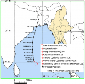 ၁။ (က) ယနေ့မြန်မာစံတော်ချိန် (၀၉:၃၀) နာရီအချိန် တိုင်းထွာချက်များအရ ဘင်္ဂလားပင်လယ် အော်အရှေ့တောင်ပိုင်းတွင် ဖြစ်ပေါ်နေသော လေဖိအားနည်းရပ်ဝန်း (Low Pressure Area) သည် ပိုမို အား ကောင်းလာကာ မုန်တိုင်းငယ် (Depression) အဖြစ်သို့ ရောက်ရှိခဲ့ပါသည်။ အဆိုပါမုန်တိုင်းငယ် (Depression) သည် အိန္ဒိယနိုင်ငံ၊ ပါရာဒစ်ပ်မြို့ (Paradip) (ဩရိဿ-Odisha)၏ တောင်ဘက် ရေမိုင် (၅၉၀) မိုင်ခန့်၊ ဒီဂါမြို့ (Digha) ၏ တောင်ဘက် ရေမိုင် (၆၇၀) မိုင်ခန့်၊ မြန်မာနိုင်ငံ၊ ကိုကိုးကျွန်းမြို့(Coco Island)၏ အနောက်တောင်ဘက် ရေမိုင် (၄၄၀) မိုင်ခန့်နှင့် ပုသိမ်မြို့ (Pathein) ၏ အနောက်တောင်ဘက် ရေမိုင် မိုင် (၆၀၀) ခန့်အကွာ ပင်လယ်ပြင်ကို ဗဟိုပြုနေပါသည်။