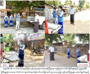 လူမှုဝန်ထမ်း၊ ကယ်ဆယ်ရေးနှင့်ပြန်လည်နေရာချထားရေးဝန်ကြီးဌာန၊ ဘေးအန္တရာယ်ဆိုင်ရာစီမံခန့်ခွဲမှုဦးစီးဌာန၊ ပြည်ထောင်စုနယ်မြေ၊ နေပြည်တော်တိုင်းဦးစီးမှူးရုံးနှင့် ဥတ္တရခရိုင်ဦးစီးမှူးရုံးမှ တာဝန်ရှိသူများသည် (၁၇-၅-၂၀၂၀) ရက်နေ့ (၁၁း၀၀) အချိန်မှ (၁၆:၀၀) အချိန်အထိ တပ်ကုန်းမြို့၊ ဘုရင့်နောင်ရပ်ကွက်၊ မြဝတီရပ်ကွက်နှင့် အနော်ရထာရပ်ကွက်များအတွင်းရှိ ပြည်သူများအား COVID-19 ရောဂါကူးစက်ပြန့်နှံ့မှုများ မဖြစ်ပွားစေရန်အတွက် သိရှိလိုက်နာဆောင်ရွက်ရမည့်အချက်များနှင့်ပတ်သက်၍ လှည့်လည်အသိပညာပေးဆော်ဩမှုများ ဆောင်ရွက်ခဲ့ကြောင်း သတင်းရရှိပါသည်။