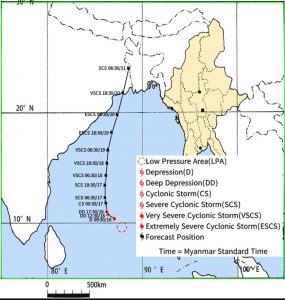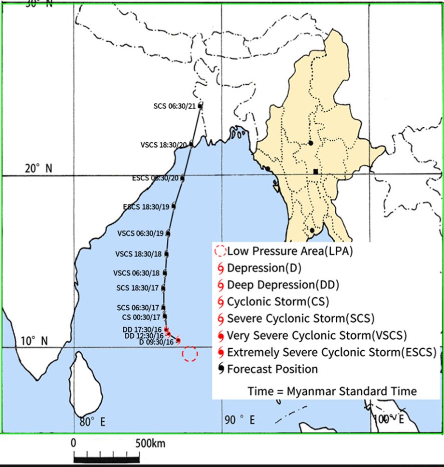 ၁။ (က) ယနေ့မြန်မာစံတော်ချိန် (၁၇:၃၀)နာရီအချိန် တိုင်းထွာချက်များအရ ဘင်္ဂလားပင်လယ်အော်အရှေ့တောင်ပိုင်းနှင့် ယင်းနှင့် ဆက်စပ်လျက်ရှိသော ဘင်္ဂလားပင်လယ်အော်အနောက်တောင်ပိုင်းတို့တွင် ဖြစ်ပေါ်နေသော အားကောင်းသော မုန်တိုင်းငယ်(Deep Depression)သည် ဆက်လက်တည်ရှိနေပါသည်။ အဆိုပါ အားကောင်းသော မုန်တိုင်းငယ် (Deep Depression)သည် အိန္ဒိယနိုင်ငံ၊ ပါရာဒစ်ပ်မြို့ (Paradip) (ဩရိဿ-Odisha)၏ တောင်-အနောက်တောင်ဘက် ရေမိုင် (၅၅၅)မိုင်ခန့်၊ ဒီဂါမြို့(Digha)၏ တောင်-အနောက်တောင်ဘက် ရေမိုင်(၆၃၈)မိုင်ခန့်၊ ဘင်္ဂလားဒေ့ရှ်နိုင်ငံ၊ ကမ်ပူပါရာမြို့(Khepupara)၏ အနောက်တောင်ဘက် ရေမိုင်(၆၉၅)မိုင်ခန့်၊ မြန်မာနိုင်ငံ၊ ကိုကိုးကျွန်းမြို့ (Coco Island)၏ အနောက်တောင်ဘက် ရေမိုင်(၄၅၈) မိုင်ခန့်နှင့် ပုသိမ်မြို့(Pathein)၏ အနောက်တောင်ဘက် ရေမိုင် (၆၀၃)မိုင်ခန့်အကွာ ပင်လယ်ပြင်ကို ဗဟိုပြုနေပါ သည်။