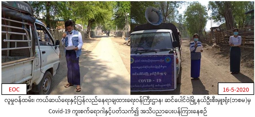လူမှုဝန်ထမ်း၊ ကယ်ဆယ်ရေးနှင့်ပြန်လည်နေရာချထားရေးဝန်ကြီးဌာန၊ ဘေးအန္တရာယ်ဆိုင်ရာစီမံခန့်ခွဲမှုဉီးစီးဌာန၊ ဆင်ပေါင်ဝဲမြို့နယ်ဦးစီးမှူးရုံးမှ တာဝန်ရှိသူများသည် (၁၆.၅.၂၀၂၀) ရက်နေ့၊ နံနက်(၀၇:၀၀) နာရီအချိန်တွင် ပြန်ကြားရေးနှင့်ပြည်သူ့ဆက်ဆံရေးဦးစီးဌာနတို့နှင့်ပူးပေါင်း၍ ဆင်ပေါင်ဝဲမြို့နယ်၊ အမှတ်(၁)၊အမှတ်(၂)၊ အမှတ်(၃)သို့သွားရောက်ပြီး COVID – 19 ရောဂါကူးစက်ပျံ့နှံ့မှုများနှင့်ပတ်သက်၍ ဆောင်ရန်ရှောင်ရန်များအား အသိပညာပေးဆော်ဩမှုများ ဆောင်ရွက်ခဲ့ကြောင်း သတင်းရရှိပါသည်။