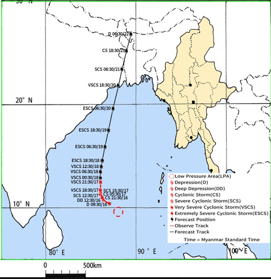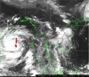 ၁။ (က) ယနေ့မြန်မာစံတော်ချိန် (၂၁:၃၀)နာရီအချိန် တိုင်းထွာချက်များအရ ဘင်္ဂလားပင်လယ် အော်တောင်ပိုင်းတွင် ဖြစ်ပေါ်နေသော အားအလွန်ကောင်းသော ဆိုင်ကလုန်းမုန်တိုင်း (Very Severe Cyclonic Storm) အမ်ဖန် (AMPHAN)သည် မြောက်ဘက်သို့ ရွေ့လျား ခဲ့ပြီး ဆက်လက်တည်ရှိနေပါသည်။ အဆိုပါ အားအလွန်ကောင်းသော ဆိုင်ကလုန်း မုန်တိုင်း (Very Severe Cyclonic Storm) အမ်ဖန် (AMPHAN) သည် အိန္ဒိယနိုင်ငံ၊ ပါရာဒစ်ပ်မြို့(Paradip) (ဩရိဿ-Odisha) ၏ တောင်ဘက် ရေမိုင် (၄၇၀)မိုင်ခန့်၊ ဒီဂါမြို့(Digha)၏ တောင်-အနောက်တောင်ဘက် ရေမိုင် (၅၅၀)မိုင်ခန့်၊ ဘင်္ဂလားဒေ့ရှ် နိုင်ငံ၊ ကမ်ပူပါရာမြို့ (Khepupara)၏ တောင်-အနောက်တောင်ဘက် ရေမိုင် (၆၁၅) မိုင်ခန့်၊ မြန်မာနိုင်ငံ၊ ကိုကိုးကျွန်းမြို့(Coco Island)၏ အနောက်-အနောက်တောင် ဘက် ရေမိုင် (၄၄၀)မိုင်ခန့်နှင့် ပုသိမ်မြို့ (Pathein) ၏ အနောက်တောင်ဘက် ရေမိုင် (၅၇၀)မိုင်ခန့်အကွာ ပင်လယ်ပြင်ကို ဗဟိုပြုနေပါသည်။