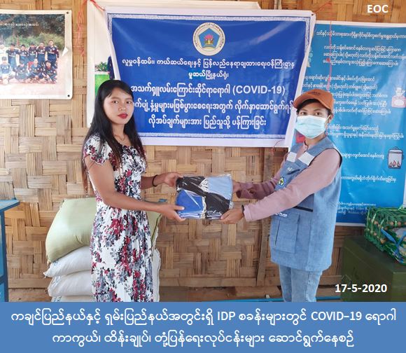 ယနေ့တွင် ကချင်ပြည်နယ်၊ ပန်ဝါမြို့နယ်ရှိ အမှတ်(၂)ဒေသပိုင် အဆောက်အဦ၊ ခိုက်ဘာဂျီ (ဆော့ဇမ်စခန်း)၊ ဖားကန့်မြို့နယ်ရှိ နမ္မဖြစ် COC ဘုရားကျောင်း၊ နမ္မဖြစ်ကက်သလစ်ဘုရားကျောင်း၊ နမ္မဖြစ်နှစ်ခြင်းဘုရားကျောင်း၊ မော်ဝမ်းမူရင်းနှစ်ခြင်း၊ မော်ဝမ်းအေဂျီဘုရားကျောင်း၊ ဆိပ်မူယူမာ နှစ်ခြင်းဘုရားကျောင်း၊ ဆိပ်မူရဝမ်နှစ်ခြင်း ဘုရားကျောင်း၊ ဆိပ်မူလီဆူးနှစ်ခြင်းဘုရားကျောင်း၊ ဆိပ်မူဆိုင်းတောင်နှစ်ခြင်း၊ ဆိပ်မူရပ်ကွက်(၄) နှစ်ခြင်း၊ လုံးခင်းလယ်ပြင်ကုဋေကျေးရွာ၊ လုံးခင်း ငြိမ်းချမ်းသာယာ COC ဘုရားကျောင်း၊ လုံးခင်းငြိမ်းချမ်းသာယာလီဆူနှစ်ခြင်း၊ လုံးခင်းရပ်ကွက်(၅) ကက်သလစ်၊ လုံးခင်းမှော်စီစာနှစ်ခြင်းနှင့် လုံးခင်းမှော်စီစာအေဂျီ IDP စခန်း စုစုပေါင်း IDP စခန်း (၁၈)ခုသို့ သွားရောက်၍ လက်သန့်ဆေးရည်(၁၇၄)ဗူး၊ ဆပ်ပြာ(၃၉၉၃)ခဲ၊ ထုံးအိတ်(၁၈၀) အိတ်နှင့် အပူချိန်တိုင်းကိရိယာ(၂၀)ခု၊ လက်ဆေးစင်(၂)ခု၊ အဝတ် Mask (၉၀၆)ခု၊ တခါသုံး Mask (၁၇၄)ခု၊ Hand Speaker (၂)ခု၊ COVID-19 အသိပညာပေး အသံဖိုင်ထည့်သွင်းထားသော Memory Stick (၂)ခုနှင့် ဗီနိုင်း(၂)ချပ်တို့အား ထောက်ပံ့ခဲ့ပါသည်။