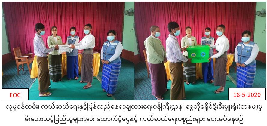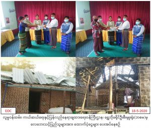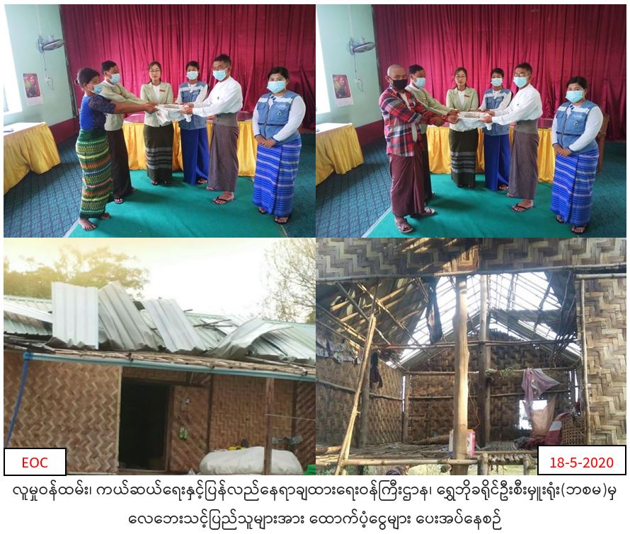 လူမှုဝန်ထမ်း၊ ကယ်ဆယ်ရေးနှင့်ပြန်လည်နေရာချထားရေးဝန်ကြီးဌာန၊ ဘေးအန္တရာယ်ဆိုင်ရာစီမံခန့်ခွဲမှုဦးစီးဌာန၊ ရွေဘိုခရိုင်ဦးစီးမှူးရုံးမှ တာဝန်ရှိသူများသည် ရွေဘိုခရိုင် ရွှေဘိုမြို့နယ် ကျောက်မြောင်းမြို့၊ကုလားမကျေးရွာအုပ်စု၊မကျည်းသုံးပင်ကျေးရွာအုပ်စုနှင့် လက်ကောက်ကျကျေးရွာအုပ်စုတို့တွင် (၁၅-၅-၂၀၂၀) ရက်နေ့ လေပြင်းတိုက်ခတ်မှုကြောင့် အမိုးလန်ပျက်စီးခဲ့သည့်အိမ်ထောင်စု(၆)စုမှ လူဦးရေ(၂၉) ဦးအတွက် ဆန်ရိက္ခာဖိုးငွေ (၆၀၉၀၀ိ/-)၊ အိမ်ဆောက်ပစ္စည်းဖိုးငွေ (၁၈၀၀၀၀ိ/-)၊ စုစုပေါင်းထောက်ပံ့ငွေ (၂၄၀၉၀၀ိ/-)နှင့် (၁၇-၅-၂၀၂၀) ရက်နေ့ ရွှေဘိုမြို့နယ်၊ ခွန်တောင်းငယ်ကျေးရွာတွင် မီးလောင်ကျွမ်းမှုကြောင့် ဘေးသင့်ခဲ့သော မီးဘေးသင့်အိမ်ခြေ (၁ )လုံး အိမ်ထောင်စု( ၁) စုမှလူဦးရေ (၂)ဦးအတွက် ဆန်ရိက္ခာဖိုး ထောက်ပံ့ငွေ (၄၂၀၀ိ/-)၊ အိမ်ဆောက်ပစ္စည်းဖိုးထောက်ပံ့ငွေ (၁၀၀၀၀၀ိ/-)၊ စုစုပေါင်းထောက်ပံ့ငွေ (၁၀၄၂၀၀ိ/-) ကယ်ဆယ်ရေးပစ္စည်း (၁၇)မျိုး( ၁)အိမ်ထောင်စာတို့အား (၁၈-၅-၂၀၂၀)ရက်နေ့ (၁၁း၁၅)အချိန်တွင် ရွှေဘိုမြို့နယ် အထွေထွေအုပ်ချုပ်ရေးဦးစီးဌာနှင့်ပူးပေါင်း၍ ဘေးသင့်ပြည်သူများထံသို့ သွားရောက်ထောက်ပံ့ပေးအပ်ခဲ့ကြောင်း သတင်းရရှိပါသည်။