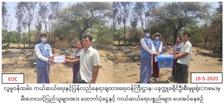 လူမှုဝန်ထမ်း၊ ကယ်ဆယ်ရေးနှင့်ပြန်လည်နေရာချထားရေးဝန်ကြီးဌာန၊ ဘေးအန္တရာယ်ဆိုင်ရာစီမံခန့်ခွဲမှုဦးစီးဌာန၊ ပခုက္ကူခရိုင်ဦးစီးမှူးရုံးမှ ပခုက္ကူမြို့နယ်၊ ဘဲကြီးကျေးရွာအုပ်စု၊ အနောက်ငကျော်ကျေးရွာတွင် (၁၆-၅-၂ဝ၂ဝ) ရက်နေ့၌ မီးလောင်ကျွမ်းမှုဖြစ်ပွားခဲ့ရာ လူနေအိမ်(၁)လုံး အိမ်ထောင်စု(၁)စု၊ လူဦးရေ(၄)ဦးမီးဘေးသင့်ခဲ့သဖြင့် မီးဘေးသင့်ပြည်သူများအတွက် ကယ်ဆယ်ရေးပစ္စည်း(၁၇)မျိုး၊ အိမ်ထောင်စု(၁)စုစာ၊ အိမ်(၁)လုံးအတွက် အိမ်ဆောက်ပစ္စည်းဖိုးထောက်ပံ့ငွေ (၁ဝဝ,ဝဝဝိ/-)၊ လူဦးရေ(၄)ဦးအတွက် ဆန်ရိက္ခာ(၇)ရက်စာဖိုးထောက်ပံ့ငွေ(၈,၄ဝဝိ/-)၊ စုစုပေါင်းထောက်ပံ့ငွေ (၁ဝ၈,၄ဝဝိ/-)အား (၁၈-၅-၂ဝ၂ဝ)ရက်နေ့(၁၁:ဝဝ)အချိန်တွင် ဘေးသင့်ပြည်သူများထံသို့ ထောက်ပံ့ပေးအပ်ခဲ့ကြောင်း သတင်းရရှိပါသည်။