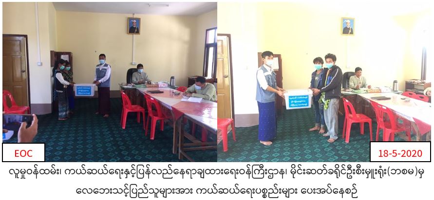 လူမှုဝန်ထမ်း၊ ကယ်ဆယ်ရေးနှင့်ပြန်လည်နေရာချထားရေးဝန်ကြီးဌာန၊ ဘေးအန္တရာယ်ဆိုင်ရာစီမံခန့်ခွဲမှုဦးစီးဌာန၊ မိုင်းဆတ်ခရိုင်ဦးစီးမှူးရုံးမှ တာဝန်ရှိသူများသည် (၁၂-၅-၂၀၂၀) ရက်နေ့ မိုင်းတုံမြို့နယ်အတွင်း ဖြစ်ပွားခဲ့သော လေပြင်းဘေးကြောင့် ပြိုလဲအိမ်ခြေ (၁၃)လုံး၊ ဘုရားရှိခိုကျောင်း (၁) ကျောင်းအတွက် အိမ်ဆောက်ပစ္စည်း ထောက်ပံ့ငွေ (၈၁၅၀၀၀ိ/-)၊ ကယ်ဆယ်ရေးပစ္စည်း (၁၀) မျိုး အိမ်ထောင်စု (၁၃) စုစာနှင့် ဆန်ရိက္ခာ လူဦးရေ (၆၁) ဦးအတွက် (၇) ရက်စာ (၁၂၈၁၀၀ိ/-)၊ စုစုပေါင်း (၉၄၃၁၀၀ိ/-) အား (၁၈-၅-၂၀၂၀) ရက်နေ့တွင် ဘေးသင့်ပြည်သူများထံသို့ ထောက်ပံ့ခဲ့ကြောင်း သတင်းရရှိပါသည်။