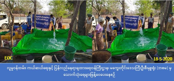လူမှုဝန်ထမ်း၊ ကယ်ဆယ်ရေးနှင့်ပြန်လည်နေရာချထားရေး၀န်ကြီးဌာန၊ ဘေးအန္တရာယ်ဆိုင်ရာ စီမံခန့်ခွဲမှုဦးစီးဌာန၊ မကွေးတိုင်းဒေသကြီးဦးစီးမှူးရုံးမှ တာဝန်ရှိသူများသည် ( ၁၈- ၅-၂၀၂၀) ရက်နေ့ (၁၁:၀၀) နာရီအချိန်တွင် သောက်သုံးရေခက်ခဲသော မကွေးမြို့နယ်၊ ကြာကန် ကျေးရွာအုပ်စု၊ ကြာကန်ကျေးရွာ(ကွက်သစ်ပိုင်း)၊ ဦးအုန်းသီး(တဲတိုက်)၊ ဦးဝင်းကြည် (တဲတိုက်)နှင့် ဒေါ်အေး(တဲတိုက်) ရှိ အိမ်ခြေ (၁၀၉) လုံး၊ အိမ်ထောင် စု(၁၂၁) စု၊ လူဦးရေ (၅၈၄) ဦးတို့အတွက် သောက်သုံးရေဂါလံ (၆,၀၀၀) အား သွားရောက်ဖြန့်ဝေပေးခဲ့ပါကြောင်းသတင်းရ ရှိပါသည်။