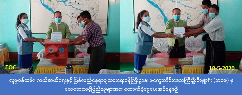 လူမှုဝန်ထမ်း၊ ကယ်ဆယ်ရေးနှင့်ပြန်လည်နေရာချထားရေးဝန်ကြီးဌာန၊ ဘေးအန္တရာယ်ဆိုင်ရာ စီမံခန့်ခွဲမှုဦးစီးဌာန၊ မကွေးတိုင်းဒေသကြီးဦးစီးမှူးရုံးမှ တာဝန်ရှိသူများသည် (၁၈-၅-၂၀၂၀) ရက်နေ့ (၁၁:၀၀) နာရီအချိန်တွင် ရေနံချောင်းမြို့နယ်၊ သစ်တပွေရပ်ကွက်၊ သစ်တပွေမြောက် ရပ်တွင် (၁၆-၅-၂၀၂၀) ရက်နေ့တွင် လေပြင်းတိုက်ခတ်မှုကြောင့်ပြိုကျအိမ်ခြေ (၁) လုံးအတွက် ထောက်ပံ့ငွေ (၁၀၀,၀၀၀/-) ကျပ်၊ လူဦးရေ (၂) ဦးအတွက် ဆန်ရိက္ခာဖိုးထောက်ပံ့ငွေ (၄,၂၀၀/-) ကျပ်၊ သေဆုံးသူ(၁) ဦးအတွက် သေဆုံးထောက်ပံ့ငွေ (၃၀၀,၀၀၀/-) ကျပ်၊ စုစုပေါင်းထောက်ပံ့ငွေ (၄၀၄,၂၀၀/-) ကျပ်နှင့် ကယ်ဆယ်ရေးပစ္စည်း(၁၆) မျိုး၊ အိမ်ထောင်စု(၁) စုစာတို့အား အထွေထွေ အုပ်ချုပ်ရေးဦးစီးဌာနမှ တာဝန်ရှိသူများနှင့်အတူ ဘေးသင့်ပြည်သူများလက်ဝယ်အရောက် ထောက်ပံ့ပေးအပ်ခဲ့ပါကြောင်း သတင်းရရှိပါသည်။