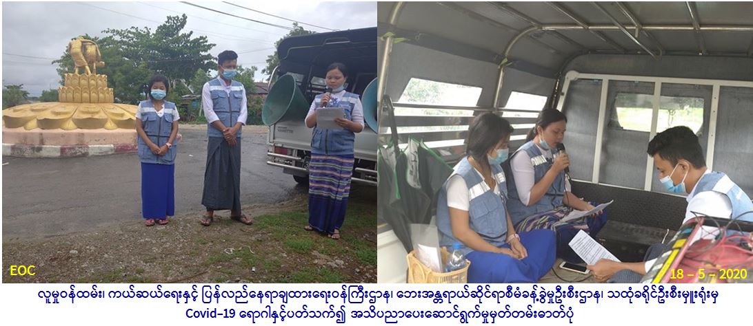 လူမှုဝန်ထမ်း၊ ကယ်ဆယ်ရေးနှင့် ပြန်လည်နေရာချထားရေး ဝန်ကြီးဌာန၊ ဘေးအန္တရာယ်ဆိုင်ရာစီမံခန့်ခွဲမှုဦးစီးဌာန၊ သထုံခရိုင် ဦးစီးမှူးရုံးမှတာဝန်ရှိသူများသည် (၁၈-၅-၂၀၂၀) ရက်နေ့ (၁၀:၀၀) နာရီအချိန်မှ (၁၅:၀၀) နာရီအချိန်ထိမွန်ပြည်နယ် သထုံခရိုင်၊ ပေါင်မြို့နယ် ကျုံဟော်ကျေးရွာနှင့် သဲကုန်းကျေးရွာတို့တွင် COVID -19 ကူးစက်ရောဂါနှင့် ပတ်သက်၍ အသိပညာပေးခြင်းအား ဆောင်ရွက်ခဲ့ပါကြောင်း သတင်းရရှိပါသည်။