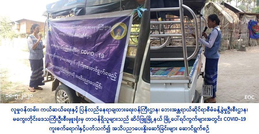 လူမှုဝန်ထမ်း၊ ကယ်ဆယ်ရေးနှင့် ပြန်လည်နေရာချထားရေးဝန်ကြီးဌာန၊ ဘေးအန္တရာယ်ဆိုင်ရာစီမံခန့်ခွဲမှုဦးစီးဌာန၊ မကွေးတိုင်းဒေသကြီးဦးစီးမှူးရုံးမှ တာဝန်ရှိသူများသည် (၁၈-၅-၂၀၂၀) ရက်နေ့၊ (၁၇:၀၀) အချိန်မှ (၂၀:၀၀) အချိန်အထိ ဆိပ်ဖြူမြို့နယ်အတွင်းရှိ မြို့ပေါ်ရပ်ကွက်များဖြစ်သော ယောဝရပ်ကွက်၊ အလယ်ပိုင်းရပ်ကွက်၊ အနောက်ပိုင်းရပ်ကွက်နှင့် ရွာသစ်ရပ်ကွက်များအတွင်း လှည့်လည်၍ COVID-19 ကူးစက်ရောဂါနှင့်ပတ်သက်ပြီး ဆောင်ရန် ရှောင်ရန် အချက်များအား အသိပညာပေးခြင်းများ ဆောင်ရွက်ခဲ့ကြောင်း သတင်းရရှိပါသည်။