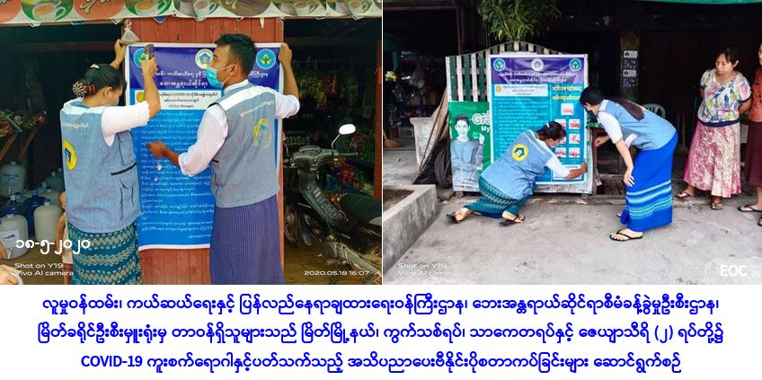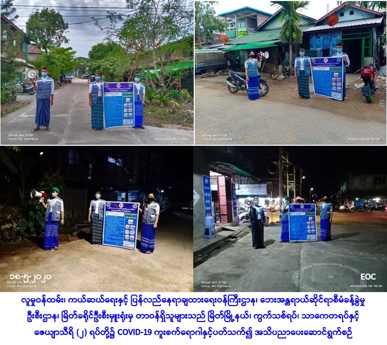 လူမှုဝန်ထမ်း၊ ကယ်ဆယ်ရေးနှင့် ပြန်လည်နေရာချထားရေးဝန်ကြီးဌာန၊ ဘေးအန္တရာယ်ဆိုင်ရာ စီမံခန့်ခွဲမှုဦးစီးဌာန၊ မြိတ်ခရိုင်ဦးစီးမှူးရုံးမှ တာဝန်ရှိသူများသည် (၁၈-၅-၂၀၂၀) ရက်နေ့တွင် မြိတ်မြို့နယ်၊ ကွက်သစ်ရပ်၊ သာကေတရပ်နှင့် ဇေယျာသီရိ (၂) ရပ်တို့၌ COVID-19 ရောဂါကူးစက်ပျံ့နှံ့မှုမရှိစေရေး အသိပညာပေးဆော်သြခြင်း၊ ဗီနိုင်းပိုစတာကပ်ခြင်းတို့အား ဆောင်ရွက်ခဲ့ကြောင်း သတင်းရရှိပါသည်။