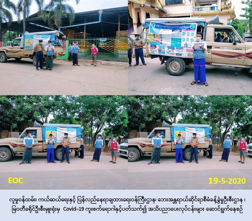 မြန်မာနိုင်ငံကြက်ခြေနီအသင်းနှင့်ပူးပေါင်း၍ မြဝတီမြို့အတွင်း အမှတ်(၁)၊ (၂)၊ (၃)၊ (၄)ရပ်ကွက် တို့တွင် Covid-19 အသက်ရှူလမ်းကြောင်းဆိုင်ရာ ရောဂါနှင့်ပတ်သက်၍ ပြည်သူများ သိရှိ လိုက်နာရန် အချက်များအား ကွင်းဆင်း၍ ကျန်းမာရေးနှင့် အားကစားဝန်ကြီးဌာနမှ ထုတ်ပြန် ထားသော အသိပေးကြေငြာချက်များ၊ လူမှုဝန်ထမ်းကယ်ဆယ်ရေးနှင့် ပြန်လည်နေရာချထား ရေးဝန်ကြီးဋ္ဌာနမှ ထုတ်ပြန်ထားသော ဥပဒေများကိုလိုက်နာရန် အသိပေးကြေငြာချက်များအား အရာထမ်း၊ အမှုထမ်းများမှ ရပ်ကွက်များအတွင်း ကြော်ငြာခြင်းများ ပြုလုပ်ခဲ့ကြောင်း သတင်း ရရှိပါသည် ။