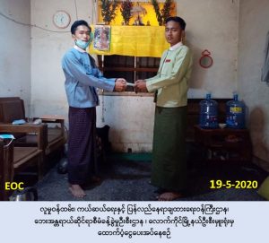 လူမှုဝန်ထမ်း၊ ကယ်ဆယ်ရေးနှင့် ပြန်လည်နေရာချထားရေးဝန်ကြီးဌာန၊ ဘေးအန္တရာယ်ဆိုင်ရာ စီမံခန့်ခွဲမှုဦးစီးဌာန၊ လောက်ကိုင်မြို့နယ်ဦးစီးမှူးရုံးမှ တာဝန်ရှိသူများသည် (၁-၃-၂၀၂၀) ရက်နေ့တွင် မိုးသီးကြွေကျမှုကြောင့် ဘေးသင့်ခံစားခဲ့ရသည့် ကိုးကန့်ကိုယ်ပိုင်အုပ်ချုပ်ခွင့်ရဒေသ၊ ကုန်ကြမ်းမြို့နယ်၊ တာ့ကုန်းကြမ်းကျေးရွာအုပ်စု၊ ရင်ဖန်ထိုကျေးရွာရှိ အိမ်ခြေ(၁၂)လုံး ၊ အိမ်ထောင်စု(၁၂)စုတို့မှ လူဦးရေ (၆၆) ဦးတို့အတွက် စုစုပေါင်းကယ်ဆယ်ရေးထောက်ပံ့ ရန်ပုံငွေ (၄၅၀,၀၀ဝိ/-) ကျပ်အား (၁၉-၅-၂၀၂၀)ရက်နေ့၊ (၁၂:၀၀)နာရီအချိန်တွင် ကုန်းကြမ်းမြို့နယ် အထွေထွေအုပ်ချုပ်ရေးဦးစီးဌာနမှတစ်ဆင့် ဘေးသင့်ပြည်သူလက်ဝယ်သို့ လွှဲပြောင်းထောက်ပံ့ ပေးအပ်ခဲ့ပါကြောင်း သတင်းရရှိပါသည်။