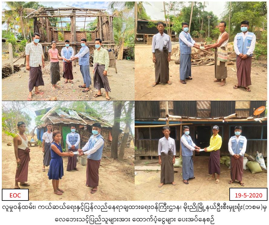 လူမှုဝန်ထမ်း၊ ကယ်ဆယ်ရေးနှင့်ပြန်လည်နေရာချထားရေးဝန်ကြီးဌာန၊ ဘေးအန္တရာယ်ဆိုင်ရာစီမံခန့်ခွဲမှုဦးစီးဌာန၊ မိုးညိုမြို့နယ်ဦးစီးမှူးရုံးမှ တာဝန်ရှိသူများသည် (၁၇/၁၈-၅-၂၀၂၀)ရက်နေ့၌ ပဲခူးတိုင်းဒေသကြီး၊ သာယာဝတီခရိုင်၊ အုတ်ဖိုမြို့နယ်၊ ကျေးရွာအုပ်စု(၄)စု ၊ ကျေးရွာ(၅)ရွာ တို့တွင် ဖြစ်ပွားခဲ့သော လေဘေးမှ အမိုးလန်နေအိမ်(၇)လုံးတို့အတွက် အိမ်ဆောက်ပစ္စည်းဖိုးထောက်ပံ့ငွေ (၁၄၅၅၀၀)ကျပ်၊ စုစုပေါင်းထောက်ပံ့ငွေ (၁၄၅၅၀၀)ကျပ်အား (၁၉-၅-၂၀၂၀)ရက်နေ့ (၁၅းဝဝ)နာရီအချိန်တွင် လေဘေးသင့်နေအိမ်၌ ကျေးရွာအုပ်ချုပ်ရေးမှူးနှင့်အတူ ပြည်သူလက်ဝယ်အရောက် ထောက်ပံ့ပေးအပ်ခဲ့ပါကြောင်း သတင်းရရှိပါသည်။