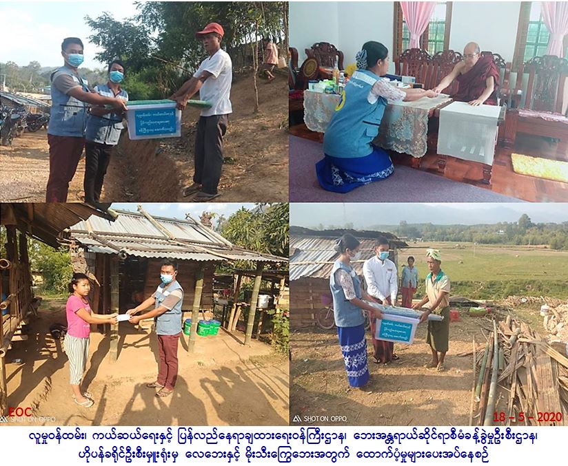 လူမှုဝန်ထမ်း၊ ကယ်ဆယ်ရေးနှင့် ပြန်လည်နေရာချထားရေး ဝန်ကြီးဌာန၊ ဘေးအန္တရာယ်ဆိုင်ရာစီမံခန့်ခွဲမှုဦးစီးဌာန၊ ဟိုပန်ခရိုင် ဦးစီးမှူးရုံးမှ တာဝန်ရှိသူများသည် သက်ဆိုင်ရာ ရပ်ကွက်/ ကျေးရွာအုပ်ချုပ်ရေးမှူး၊ ရပ်/ကျေးစာရေးများနှင့်ပူးပေါင်း၍ (၁၄-၅-၂၀၂၀)ရက်နေ့ ဖြစ်ပွားခဲ့သည့် လေဘေးနှင့် မိုးသီးကြွေဘေးကြောင့် အမိုးလန်ပျက်စီးခဲ့သည့် အိမ်ထောင်စု (၁၁၄)စု ဘာသာရေး ကျောင်း (၁) ကျောင်းတို့အတွက် အိမ်ဆောက်ပစ္စည်းဖိုး (၇၀၆၇၀၀၀/-) ကျပ်၊ ပြိုကျပျက်စီးခဲ့သည့် အိမ်ထောင်စု (၅) စုအတွက် ကယ်ဆယ်ရေးပစ္စည်း (၁၇)မျိုး (၅)စု၊ အိမ်ဆောက် ပစ္စည်းဖိုးထောက်ပံ့ငွေ (၅၀၀၀၀၀/-)ကျပ်အား ထောက်ပံ့ပေးခဲ့ရာ စုစုပေါင်း ထောက်ပံ့ငွေ (၇၅၆၇၀၀၀/-)ကျပ်နှင့် ကယ်ဆယ်ရေးပစ္စည်း (၁၇)မျိုး (၅) စုစာအား (၁၈- ၅ -၂၀၂၀) နံနက် (၁၄:၀၀) နာရီအချိန် တွင် ပြည်သူများလက်ဝယ်သို့ သွားရောက်ထောက်ပံ့ပေးအပ် ခဲ့ပါကြောင်း သတင်းရရှိပါသည်။