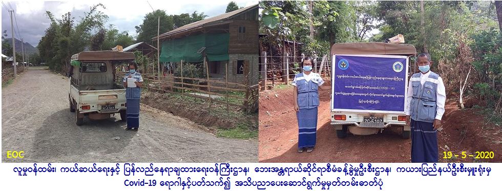 လူမှုဝန်ထမ်း၊ ကယ်ဆယ်ရေးနှင့် ပြန်လည်နေရာချထားရေး ဝန်ကြီးဌာန၊ ဘေးအန္တရာယ်ဆိုင်ရာစီမံခန့်ခွဲမှုဦးစီးဌာန၊ ကယား ပြည်နယ်ဦးစီးမှူးရုံးမှ တာဝန်ရှိသူများသည် (၁၉.၅.၂၀၂၀) ရက်နေ့တွင် ဒီးမော့ဆိုမြို့နယ်၊ ထီးပိုးကလိုးကျေးရွာအုပ်စု၊ ဒေါတဒါး ကျေးရွာ၊ ဒေါခူလီကျေးရွာ၊ ငွေတောင်ကျေးရွာအုပ်စု၊ ဒေါပေါ်ကလဲကျေးရွာ၊ ပါဒေါဒူကျေးရွာနှင့် ဒေါဖုကျေးရွာအုပ်စု၊ ဒေါလော်ခူ ကျေးရွာ များရှိ ပြည်သူများအား COVID-19 ကူးစက်ရောဂါ ပြန့်ပွားမှုမဖြစ်ပွားစေရန်အတွက် သိရှိလိုက်နာရန်အချက်များနှင့် သဘာဝဘေးအန္တရာယ်နှင့် စပ်လျဉ်းသည့် ဆောင်ရန်၊ ရှောင်ရန်များကို အသိပညာဖြန့်ဝေခဲ့ပါကြောင်း သတင်းရရှိပါသည်။