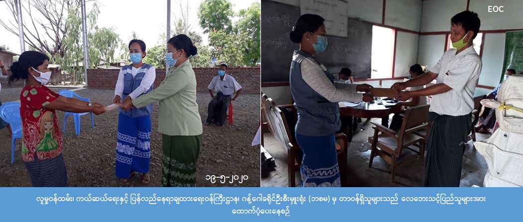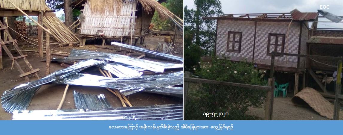 ဂန့်ဂေါခရိုင်၊ ဂန့်ဂေါမြို့နယ်၊ မြောက်ခင်ရန်းကျေးရွာ၊ တောင်ခင်ရန်းကျေးရွာ၊ တော်ဝင်ကျေးရွာ၊ သာလင်းကျေးရွာ၊ ကုန်းရွာကျေးရွာတို့တွင် (၁၈-၅-၂၀၂၀) ရက်နေ့(၁၈:၃၀)နာရီအချိန်၌ မိုးသက် လေပြင်းများ တိုက်ခတ်မှုကြောင့် အမိုးလန်ပျက်စီးခဲ့သည့် နေအိမ် (၅) လုံး၊ အိမ်ထောင်စု (၅) စု၊လူဦးရေ (၂၃) ဦးတို့အတွက် ဆန်ရိက္ခာဖိုး (၄၈,၃၀၀) ကျပ်၊ အိမ်ဆောက်ပစ္စည်းဖိုး(၄၀၀,၀၀၀) ကျပ်၊ စုစုပေါင်း (၄၄၈,၃၀၀) ကျပ်တို့ကို လူမှုဝန်ထမ်း၊ ကယ်ဆယ်ရေးနှင့် ပြန်လည်နေရာချထားရေးဝန်ကြီးဌာန၊ ဘေးအန္တရာယ်ဆိုင်ရာ စီမံခန့်ခွဲမှုဦးစီးဌာန၊ ဂန့်ဂေါခရိုင်ဦးစီးမှူးရုံးမှ တာဝန်ရှိသူများသည် ကျေးရွာ အုပ်ချုပ်ရေးမှူးများနှင့်အတူ လေဘေးသင့်ပြည်သူများထံသို့ လက်ဝယ်အရောက် (၁၉-၅-၂၀၂၀) ရက် နေ့(၁၃:၀၀)နာရီအချိန်တွင် ထောက်ပံ့ပေးခဲ့ကြောင်း သိရှိရပါသည်။