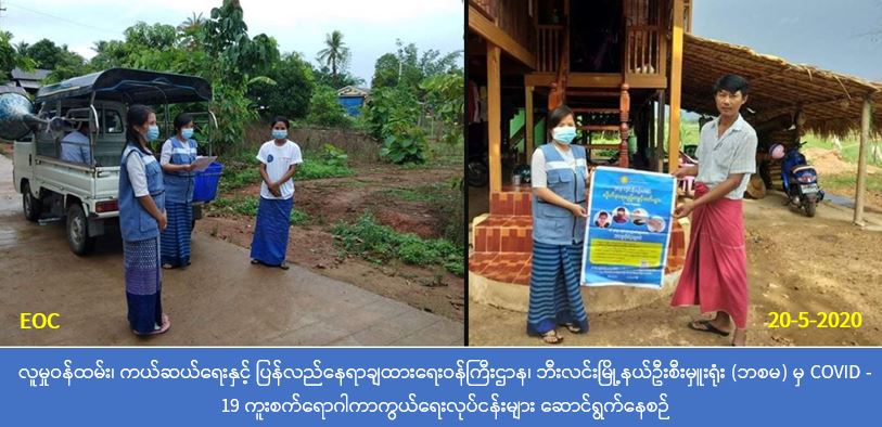 လူမှုဝန်ထမ်း၊ ကယ်ဆယ်ရေးနှင့် ပြန်လည်နေရာချထားရေးဝန်ကြီးဌာန၊ ဘေးအန္တရာယ်ဆိုင်ရာ စီမံခန့်ခွဲမှုဉီးစီးဌာန၊ မွန်ပြည်နယ်၊ သထုံခရိုင်၊ ဘီးလင်းမြို့နယ်ဦးစီးမှူးရုံးမှ တာဝန်ရှိသူများသည် (၂၀-၅-၂၀၂၀) ရက်နေ့ (၀၇:၃၀) နာရီအချိန်မှ စတင်ပြီး ဘီးလင်းမြို့နယ်၊ တဘက်ဆွဲကျေးရွာ အုပ်စုအတွင်းရှိ တဘက်ဆွဲကျေးရွာနှင့် ဒေါင်းရွာကျေးရွာတို့တွင် COVID -19 ကူးစက်ရောဂါနှင့် ပတ်သက်ပြီး ဆောင်ရန်/ ရှောင်ရန်တို့ကို ကျေးရွာအုပ်ချုပ်ရေးမှူးများနှင့်အတူ ပူးပေါင်း၍ ဆောင်ရွက်လျက်ရှိကြောင်း သတင်းရရှိပါသည်။