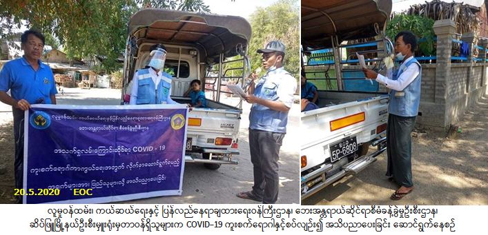 လူမှုဝန်ထမ်း၊ ကယ်ဆယ်ရေးနှင့် ပြန်လည်နေရာချထားရေးဝန်ကြီးဌာန၊ ဘေးအန္တရာယ်ဆိုင်ရာစီမံခန့်ခွဲမှုဦးစီး ဌာန၊ ဆိပ်ဖြူမြို့နယ်ဦးစီးမှူးရုံးမှတာဝန်ရှိသူများသည် (၂၀-၅-၂၀၂၀) ရက်နေ့၊ (၀၇:၀၀) နာရီအချိန်မှ (၁၀:၀၀) နာရီအချိန်အထိ မကွေးတိုင်းဒေသကြီး၊ ပခုက္ကူခရိုင်၊ ဆိပ်ဖြူမြို့နယ်၊ ဂွေးပင် ကျေးရွာအုပ်စုရှိ ဂွေးပင်ကျေးရွာနှင့် ထန်းပင်ချောင်းကျေးရွာတို့၌ COVID-19 ကူးစက်ရောဂါနှင့်စပ်လျဉ်း၍ ဆောင်ရန်/ရှောင်ရန်အချက်များကို လှည့်လည်အသိပညာပေးနှိုးဆော်ခဲ့ပါကြောင်း သတင်းရရှိပါသည်။