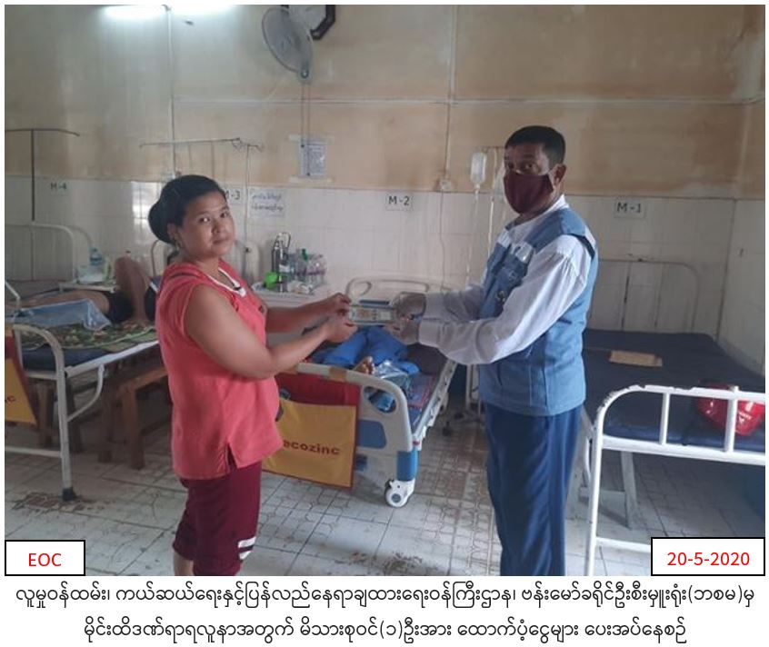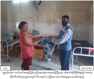 လူမှုဝန်ထမ်း၊ ကယ်ဆယ်ရေးနှင့်ပြန်လည်နေရာချထားရေးဝန်ကြီးဌာန၊ ဘေးအန္တရာယ်ဆိုင်ရာစီမံခန့်ခွဲမှုဦးစီးဌာန၊ ဗန်းမော်ခရိုင်ဦးစီးမှူးရုံးမှ တာဝန်ရှိသူများသည် (၁၉-၅-၂၀၂၀)ရက်နေ့(၁၈း၁၅)နာရီအချိန်တွင် မိုးမောက်မြို့နယ်၊ ဆန်းဂမ်ကျေးရွာအနီး၊ တာပိန်မြစ်ဘေး၌ မိုင်းနင်းမိပေါက်ကွဲခဲ့ရာ ဗန်းမော်ခရိုင်၊ ဗန်းမော်မြို့နယ်၊ ကုန်းမဟတ်ကျေးရွာနေပြည်သူ(၁)ဦး ထိခိုက်ဒဏ်ရာရရှိခဲ့ရာ ထိုမိုင်းနင်းမိ ဒဏ်ရာရ (၁)ဦးအတွက် ထောက်ပံ့ငွေ(၅၀၀၀၀ိ/-)ကို (၂၀-၅-၂၀၂၀)ရက်နေ့ (၁၄း၃၀)နာရီအချိန်တွင် ထောက်ပံ့ပေးအပ်ခဲ့ကြောင်း သတင်းရရှိပါသည်။