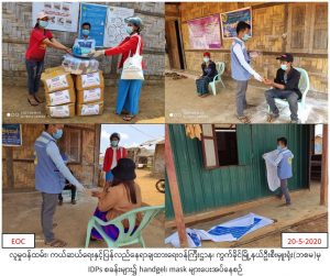 လူမှုဝန်ထမ်း၊ ကယ်ဆယ်ရေးနှင့်ပြန်လည်နေရာချထားရေးဝန်ကြီးဌာန၊ ဘေးအန္တရာယ်ဆိုင်ရာစီမံခန့်ခွဲမှုဦးစီးဌာန၊ ကွတ်ခိုင်မြို့နယ်ဦးစီးမှူးရုံးမှ တာဝန်ရှိသူများသည် (၂၀.၅. ၂၀၂၀) ရက်နေ့တွင် ကွတ်ခိုင် မြို့နယ်အတွင်း IDP(camps) ပန်ကူ အိမ်ထောင်စု (၁၀၅)၊ လူဦးရေ(၆၃၆)တို့အတွက် လူတစ်ဦးလျှင် အဝတ်masks(၂)ခု နှုန်း၊ အိမ်ထောင်စုတစ်စုလျှင် ရေမလိုလက်သန့်ဆေးရေ(Hand Gel) (၂)ဗူးနှုန်းဖြင့် စုစုပေါင်းအဝတ်masks(၁၂၇၂)ခု၊ ရေမလိုလက်သန့်ဆေးရေ(Hand Gel) (၂၁၀)ဗူး တို့ကို ထောက်ပံ့ပေးခဲ့ပြီး အဝတ်masksနှင့်ပက်သက်၍ စနစ်တကျအသုံးပြုနည်းဗီနိုင်းပိုစတာကပ်ခြင်းများ ဆောင်ရွက်ခဲ့ကြောင်း သတင်းရရှိပါသည်။