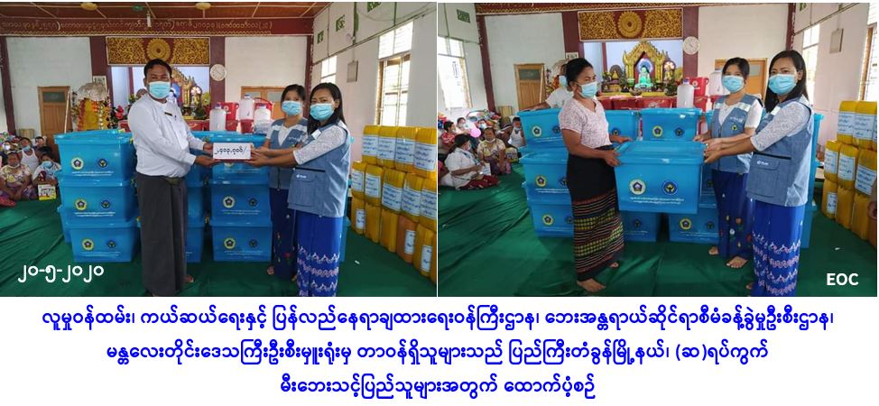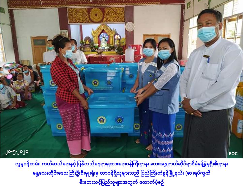 လူမှုဝန်ထမ်း၊ ကယ်ဆယ်ရေးနှင့် ပြန်လည်နေရာချထားရေးဝန်ကြီးဌာန၊ ဘေးအန္တရာယ်ဆိုင်ရာ စီမံခန့်ခွဲမှုဦးစီးဌာန၊ မန္တလေးတိုင်းဒေသကြီးဦးစီးမှူးရုံးမှ တာဝန်ရှိသူများသည် ပြည်ကြီးတံခွန်မြို့နယ်၊ (ဆ)ရပ်ကွက်၌ (၁၉-၅-၂၀၂၀) ရက်နေ့တွင် ဖြစ်ပွားခဲ့သော မီးဘေးကြောင့် အိမ်ခြေအလုံး (၂၀)၊ အိမ်ထောင်စု(၂၄)စုမှ လူဦးရေ(၉၇)ဦး မီးဘေးသင့်ခဲ့ပြီး အဆိုပါမီးဘေးသင့်အိမ်ထောင်စုများအတွက် ကယ်ဆယ်ရေးပစ္စည်း (၁၆)မျိုးပါ အိမ်ထောင်စု(၂၀)စုစာနှင့် ကယ်ဆယ်ရေးပစ္စည်း (၁၇) မျိုးပါ အိမ်ထောင်စု(၄)စုစာ၊ လူဦးရေ(၉၇)ဦးအတွက် ဆန်ရိက္ခာဖိုးထောက်ပံ့ငွေ (၂၀၃,၇၀၀) ကျပ်နှင့် အိမ်ဆောက်ပစ္စည်းဖိုးထောက်ပံ့ငွေကျပ်(၂,၂၀၀,၀၀၀)ကျပ်၊ စုစုပေါင်းထောက်ပံ့မှုငွေကျပ် (၂,၄၀၃,၇0၀) ကျပ်တိတိအား (၂၀-၅-၂၀၂၀) ရက်နေ့၊ (၁၆:၀၀) နာရီအချိန်တွင် သွားရောက်ထောက်ပံ့ခဲ့ကြောင်း သတင်းရရှိပါသည်။