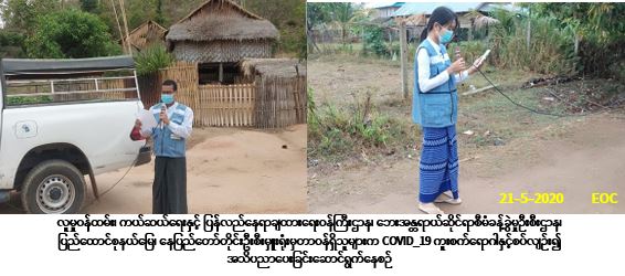 လူမှုဝန်ထမ်း၊ ကယ်ဆယ်ရေးနှင့် ပြန်လည်နေရာချထားရေးဝန်ကြီးဌာန၊ ဘေးအန္တရာယ်ဆိုင်ရာစီမံခန့်ခွဲမှုဉီးစီးဌာန၊ ပြည်ထောင်စုနယ်မြေ၊ နေပြည်တော်တိုင်းဦးစီးမှူးရုံးမှတာဝန်ရှိသူများသည် (၂၁-၅-၂၀၂၀) ရက်နေ့၊ (၀၉:၀၀)နာရီအချိန်မှ (၁၅:၀၀)နာရီအချိန်အထိ လယ်ဝေးမြို့နယ်၊ ဥသျှစ်လှိုင်းကျေးရွာအုပ်စု၊ ဥသျှစ်လှိုင်းကျေးရွာ၊ ချင်ပြစ်ကျေးရွာ၊ ကျောက်မီးကူကျေးရွာ၊ ပေပင်ကျေးရွာ၊ ထိန်တောကျေးရွာနှင့် အောင်မင်္ဂလာကျေးရွာများ၌ COVID-19 ကူးစက်ရောဂါနှင့်စပ်လျဉ်း၍ ဆောင်ရန်/ရှောင်ရန်အချက်များကို လှည့်လည်အသိပညာပေးနှိုးဆော်ခဲ့ပါကြောင်း သတင်းရရှိပါသည်။
