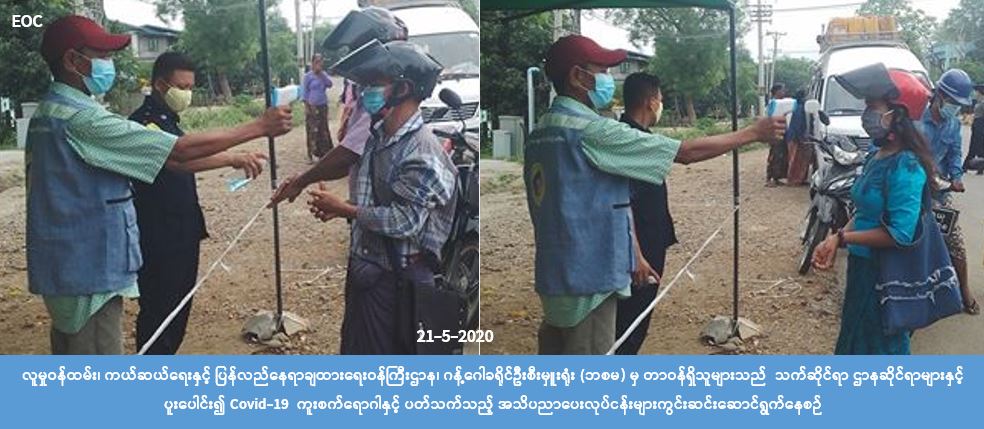 လူမှုဝန်ထမ်း၊ ကယ်ဆယ်ရေးနှင့် ပြန်လည်နေရာချထားရေးဝန်ကြီးဌာန၊ ဘေးအန္တရာယ်ဆိုင်ရာစီမံခန့် ခွဲမှုဦးစီးဌာန၊ ဂန့်ဂေါခရိုင်ဦးစီးမှူးရုံးမှ တာဝန်ရှိသူများသည် မြို့နယ်အထွေထွေအုပ်ချုပ်ရေးဦးစီးဌာန၊ ပရဟိတအဖွဲ့နင့် ဌာနဆိုင်ရာများဖြင့်ပူးပေါင်း၍ (၂၁-၅-၂၀၂၀) ရက်နေ့ (ဝ၈:၃၀) နာရီမှ (၁၇:၃၀) နာရီအချိန်ထိ လတ်တလောနိုင်ငံအသီးသီးတွင် ကူးစက်ပြန့်ပွားလျက်ရှိသည့် COVID-19 ရောဂါကြိုတင် ကာကွယ်ရေးအတွက် ဂန့်ဂေါခရိုင်အတွင်းယာဉ်ဝင်/ထွက်အတွက်စီးနင်းလိုက်ပါလာသောခရီးသည်များ အား ကိုယ်အပူချိန်တိုင်းတာပေးခြင်းနှင့် ပြည်တွင်း/ပမှ ပြန်လာသူများအားစာရင်းပြုစုခြင်းတို့ကို ဆောင်ရွက်ခဲ့ကြောင်း သိရှိရပါသည်။